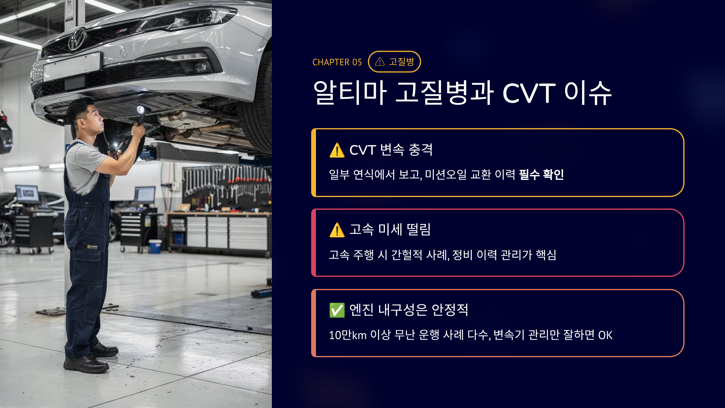 그래서 알티마 중고차 가격을 찾는 분들은 시세보다 고질병부터 확인합니다.