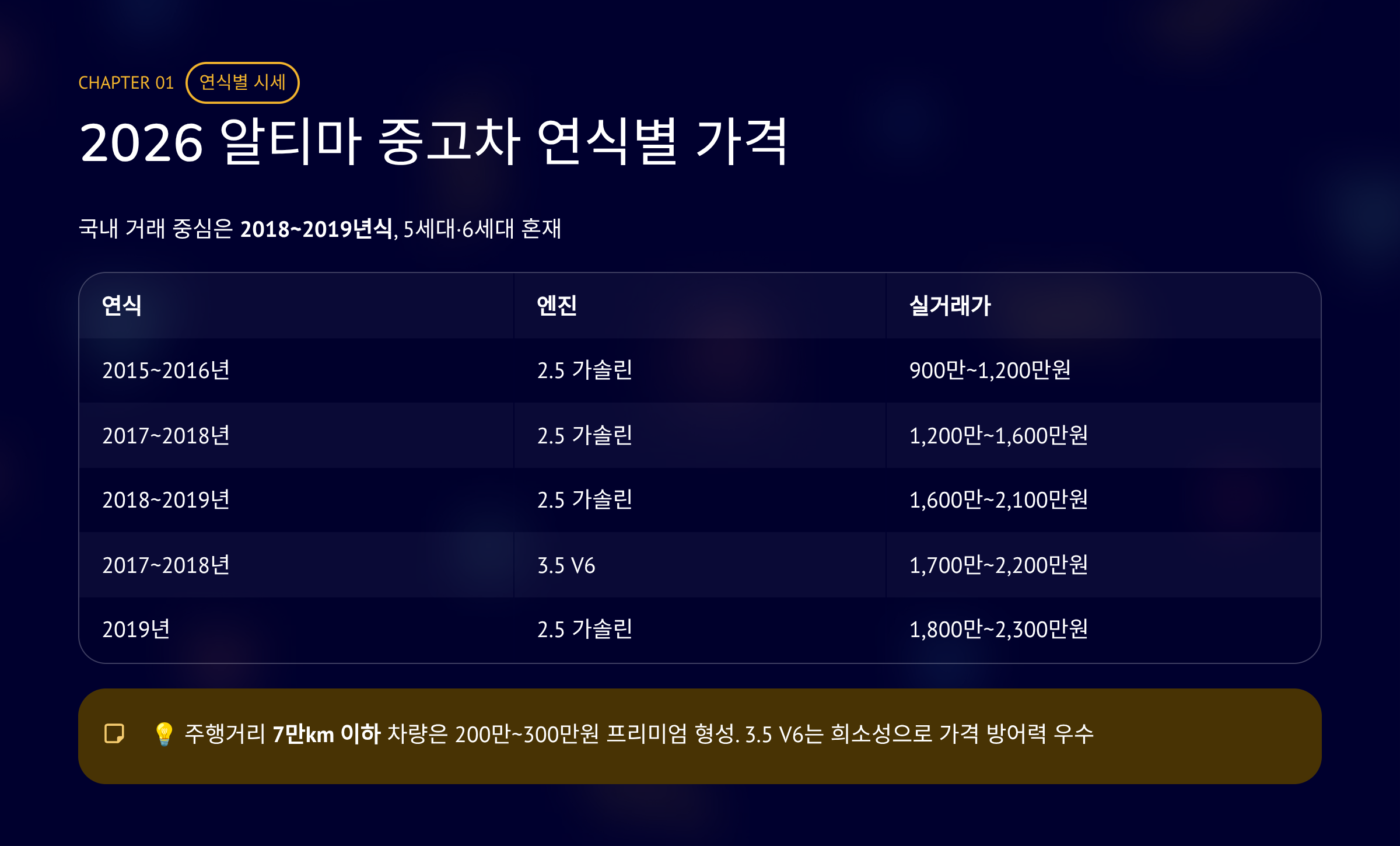 알티마 중고차는 국내에서 5세대와 6세대가 거래됩니다. 현재 중고 거래 중심은 2018~2019년식입니다.