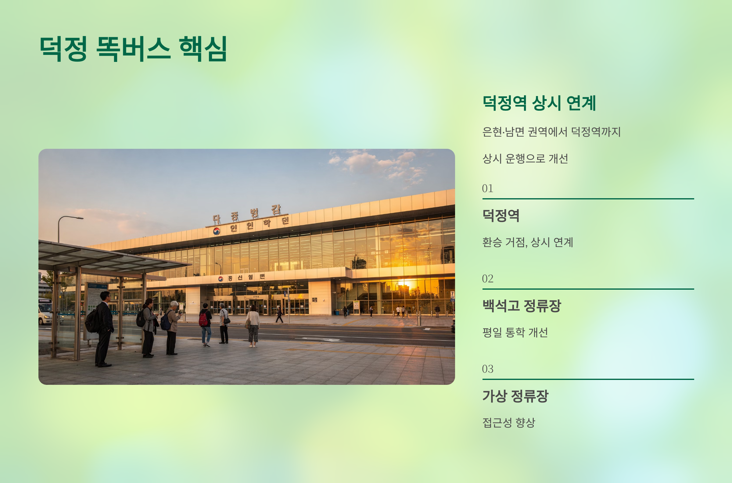 덕정 똑버스는 덕정역을 환승 거점으로 삼아, 은현·남면 등 권역에서 덕정역까지 상시 운행하도록 개선된 안내가 확인됩니다.