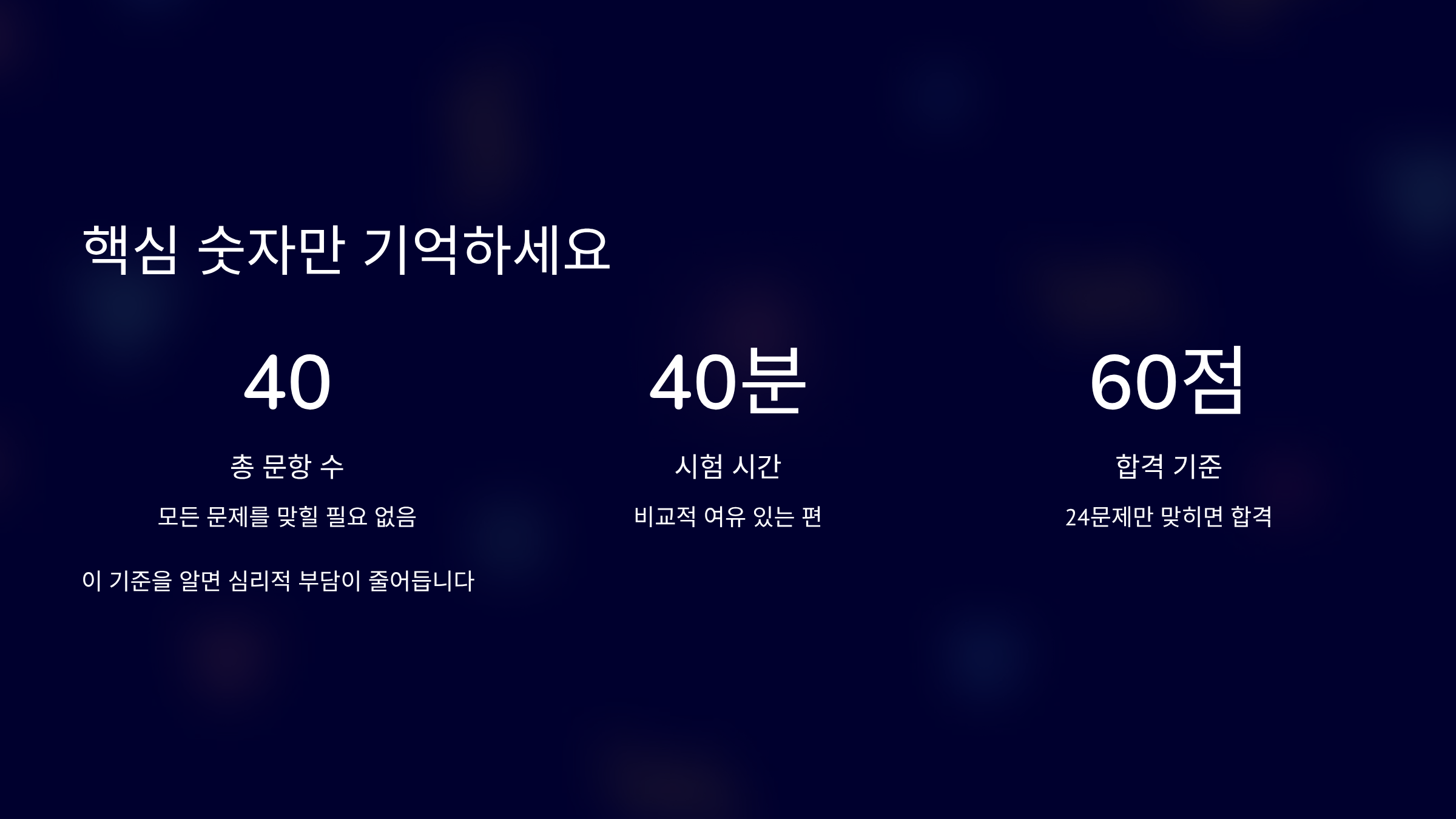 합격점수는 60점 이상입니다. 즉, 24문제만 정확히 맞히면 됩니다.