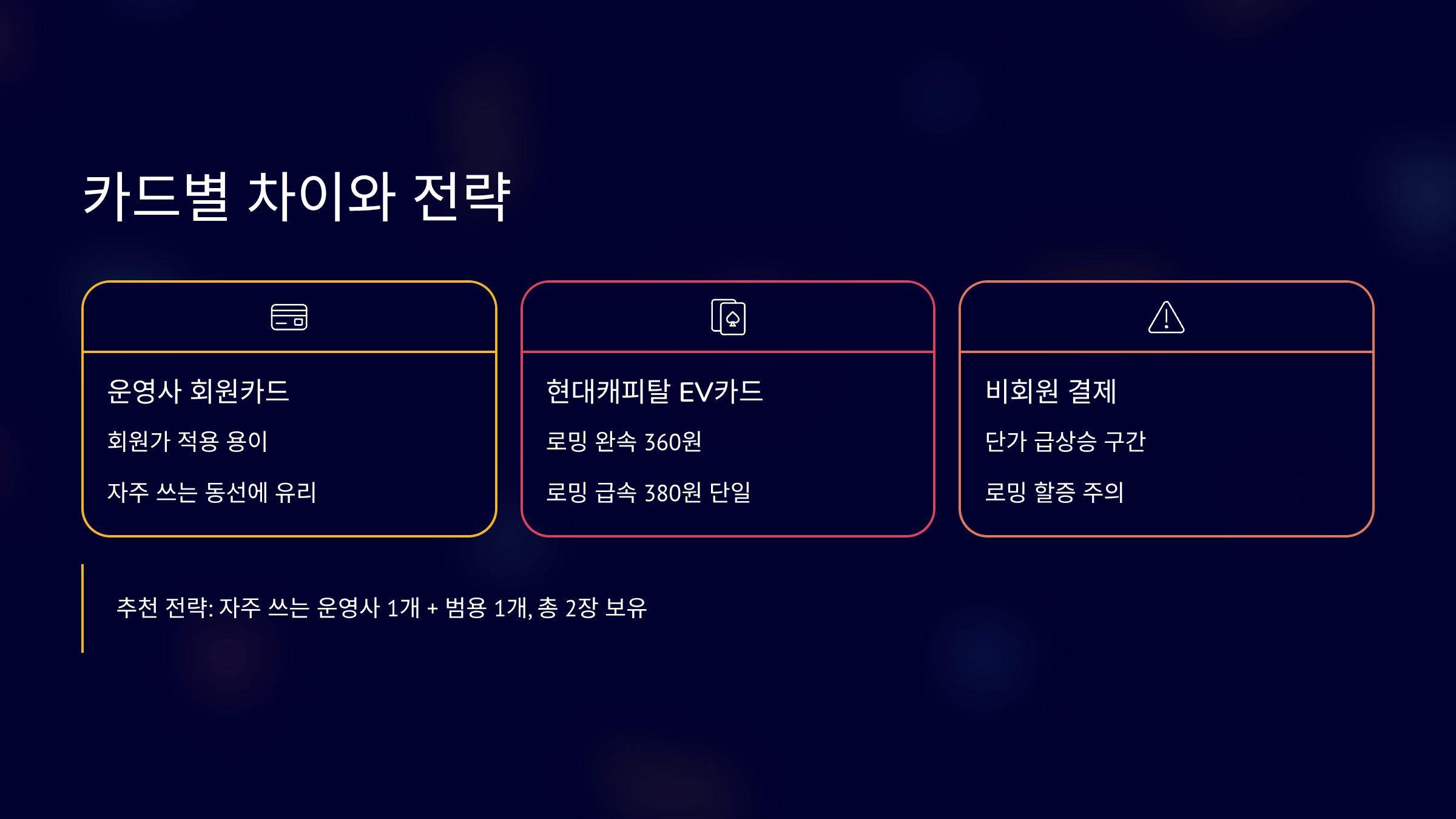 현대캐피탈 EV충전카드처럼 로밍 완속 360원, 급속 380원 단일 체계를 내세우는 카드도 있습니다.