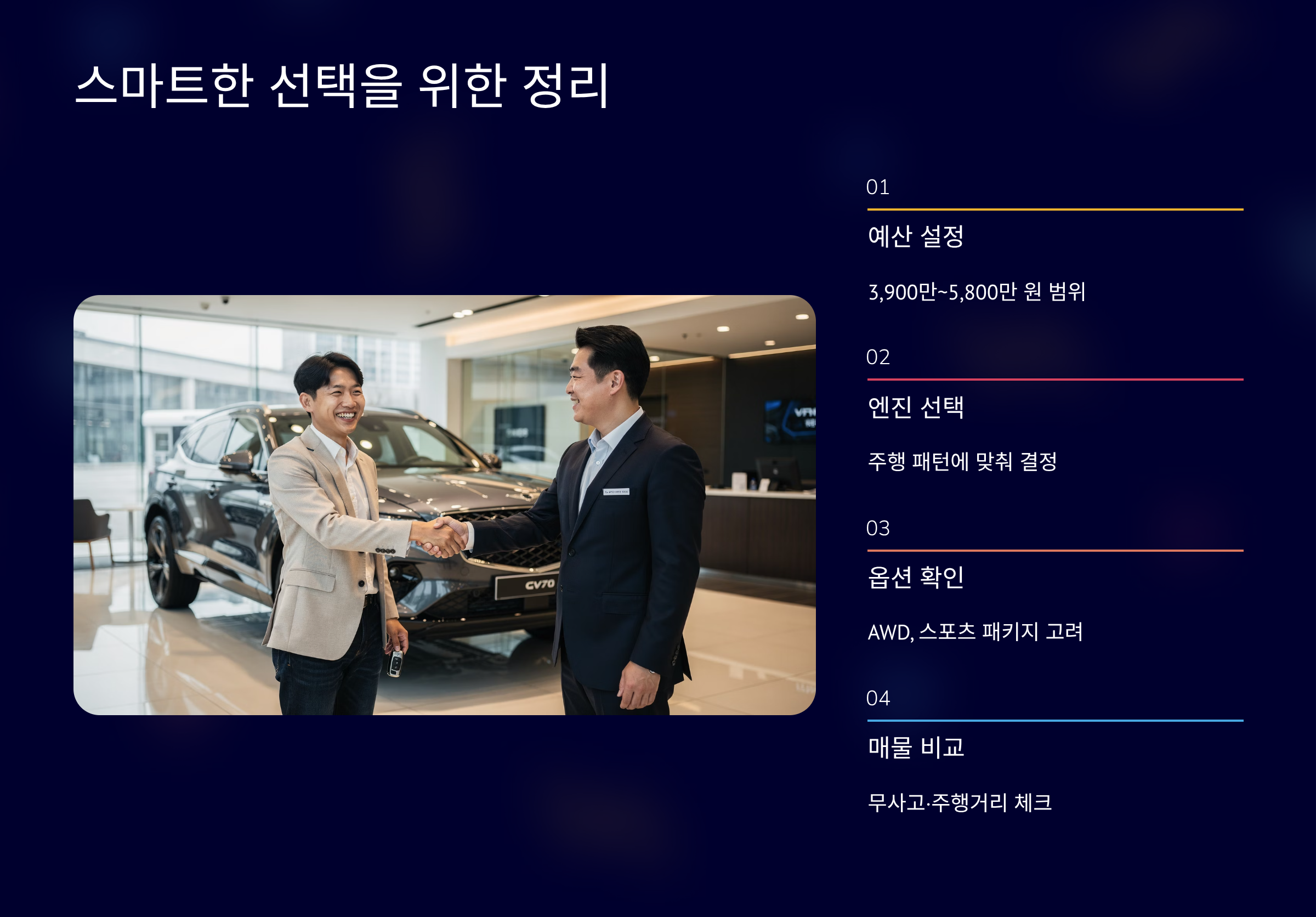 2021년 2.2 디젤은 3,700만~4,300만 원입니다. 2022년 3.5 터보는 4,500만~5,200만 원입니다. 2023년 2.5 터보 평균 4,900만 원입니다. 감가율은 3년 기준 약 25~30%입니다. AWD 옵션은 150만~250만 원 높습니다. GV70은 동급 수입 SUV 대비 감가 방어가 강한 편입니다. 딜러 현장에서는 화이트·마칼루그레이 매물이 빠르게 거래됩니다. 트림과 옵션 구성을 반드시 비교해야 합니다.