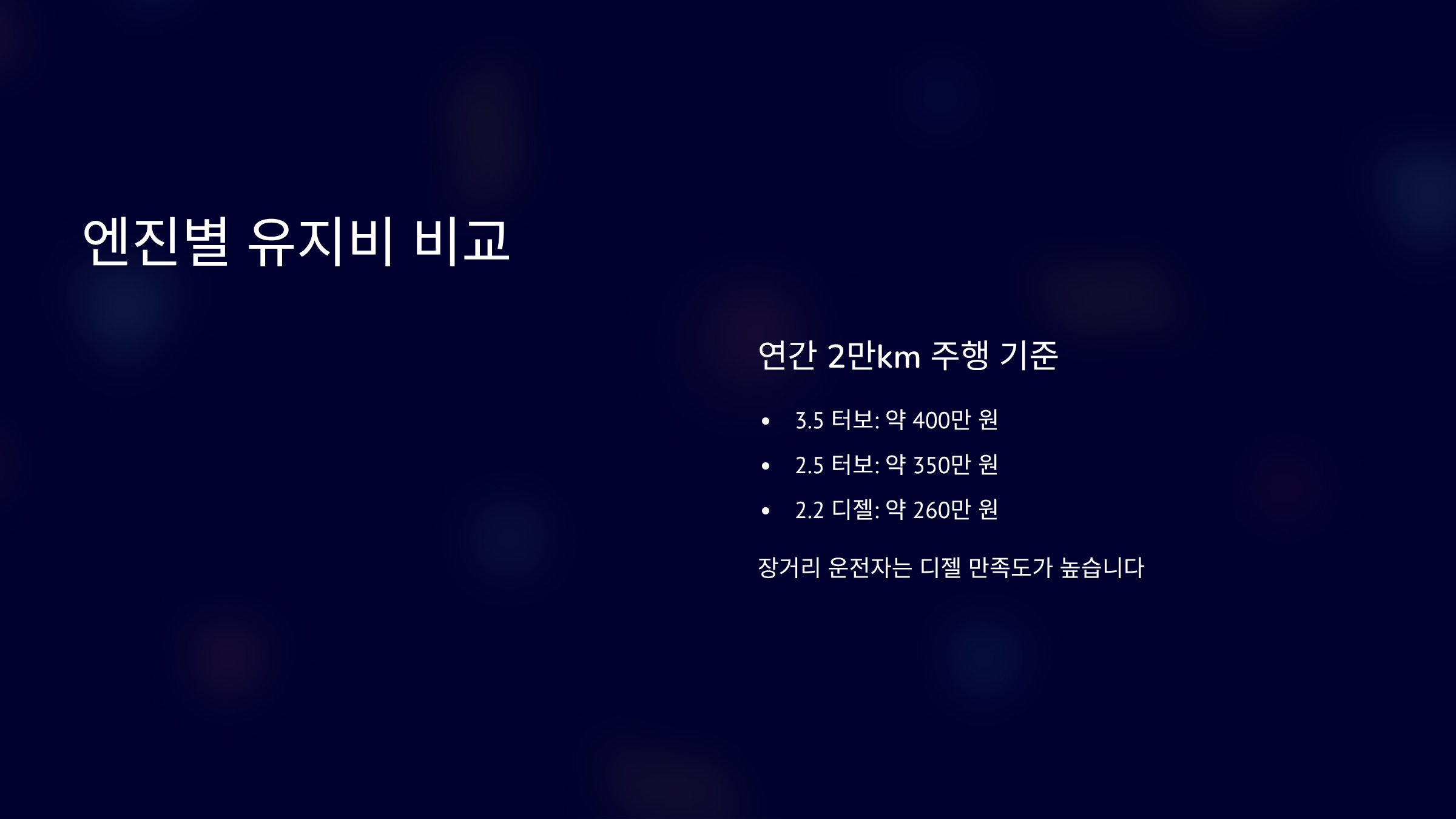 3.5 터보 최고출력은 380마력입니다. 공인연비는 8.6km/L입니다. 실주행은 7~8km/L 정도입니다. 2.2 디젤 공인연비는 13.6km/L입니다. 실주행은 12km/L 수준입니다. 경유 1,600원 기준 연 2만km 주행 시 약 260만 원입니다. 가솔린은 약 400만 원 수준입니다. 장거리 운행자는 디젤 만족도가 높다는 후기가 많습니다.