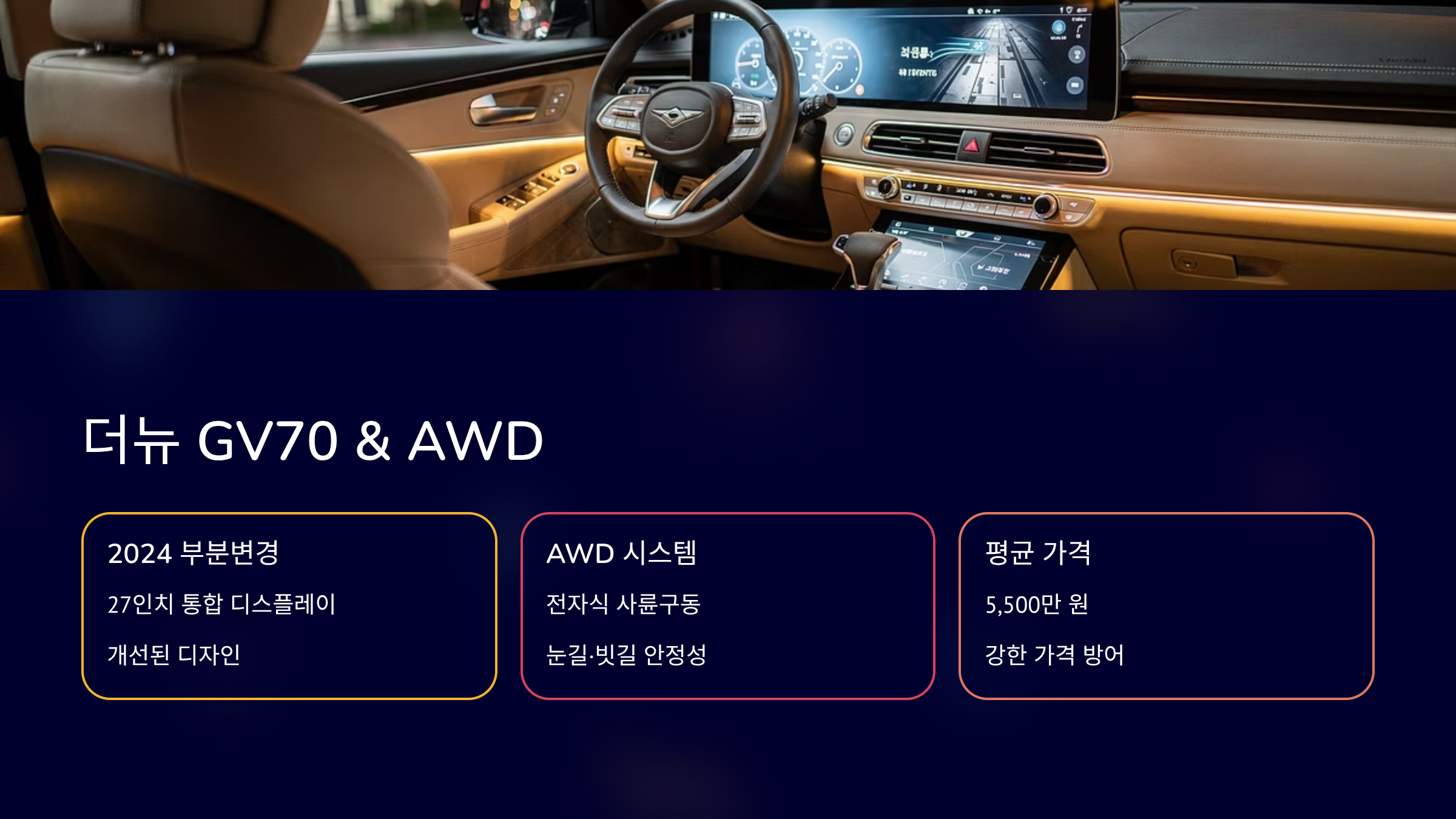 2024년 부분변경 모델은 디자인이 개선되었습니다. 실내 27인치 통합 디스플레이가 적용되었습니다. AWD는 전자식 사륜구동 시스템입니다. 눈길·빗길 안정성이 강점입니다. 2024년식 AWD 평균 5,500만 원입니다. 부분변경 모델은 가격 방어가 강합니다. 후기에서는 승차감이 더욱 부드러워졌다고 합니다. 프리미엄 SUV 수요가 꾸준합니다.