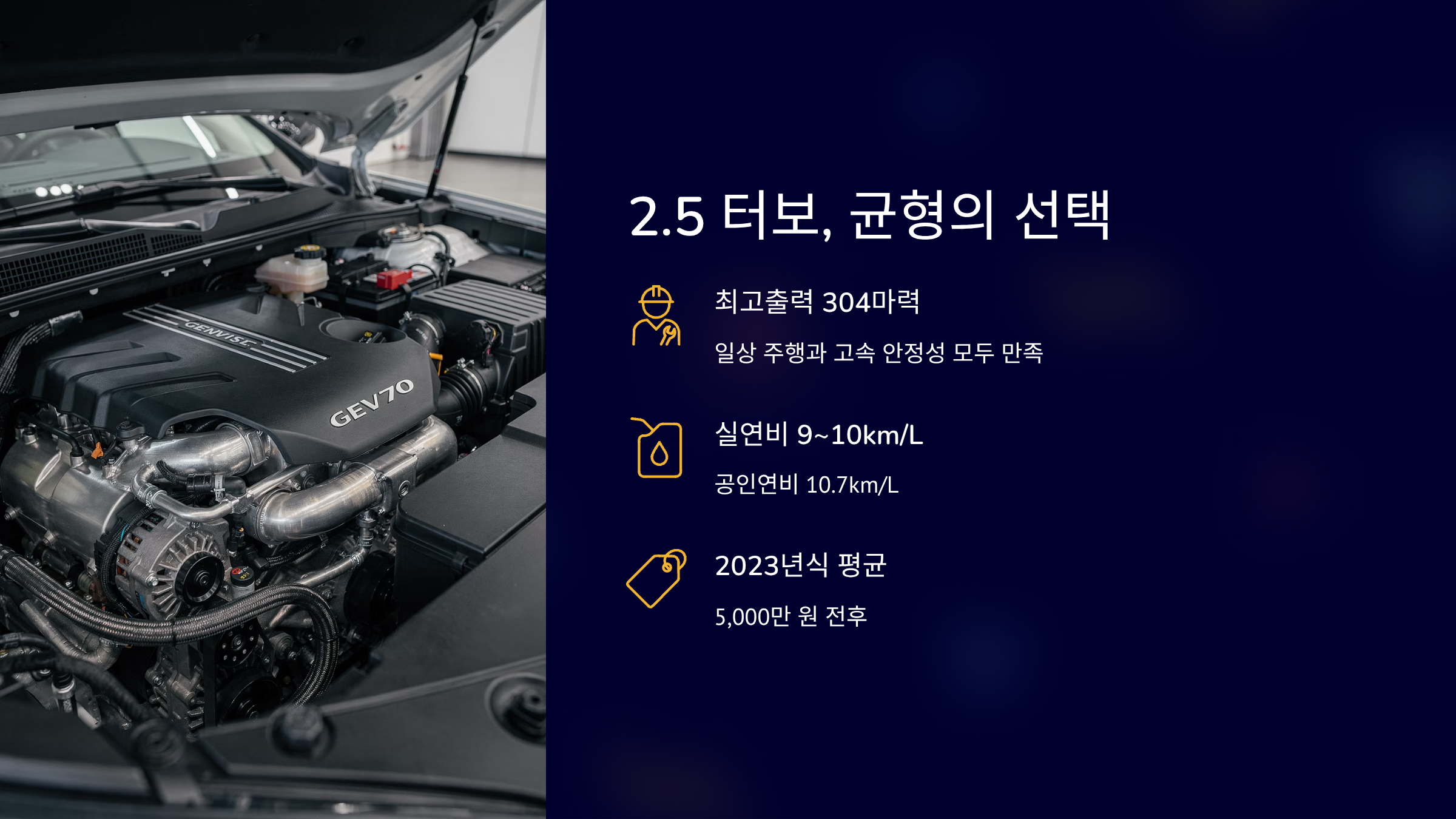 Q. 추천 엔진은 무엇인가요? A. 2.5 터보가 균형 잡힌 선택입니다.
