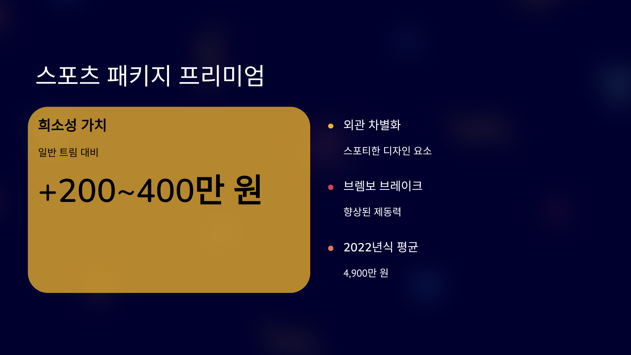 스포츠 패키지는 외관 차별화가 특징입니다. 브렘보 브레이크가 적용됩니다. 2022년식 스포츠 패키지 평균 4,900만 원입니다. 일반 트림 대비 200만~400만 원 높습니다. 희소성으로 가격이 유지됩니다. 중고 시장에서도 프리미엄이 붙는 편입니다. 후기에서는 주행 안정감이 뛰어나다는 평가가 많습니다. 고급감과 스포티함을 동시에 추구합니다.