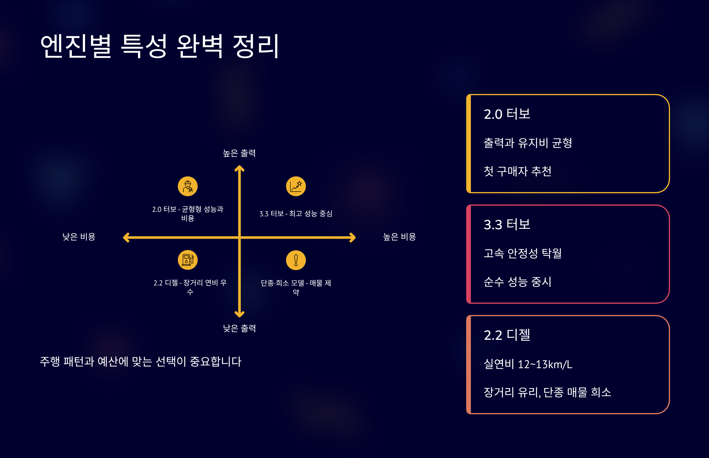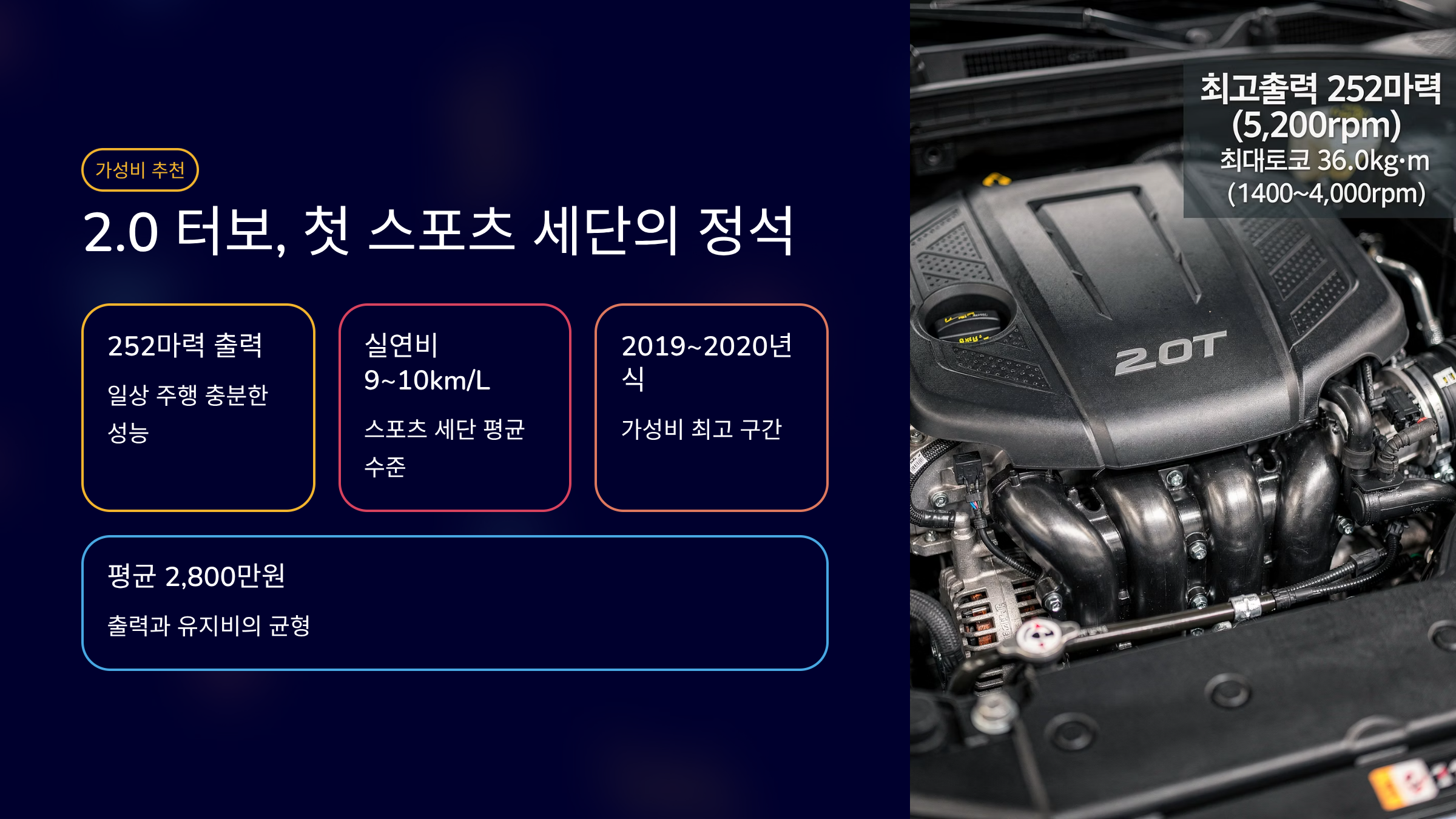 Q. 추천 엔진은 무엇인가요? A. 2.0 터보가 균형 잡힌 선택입니다.