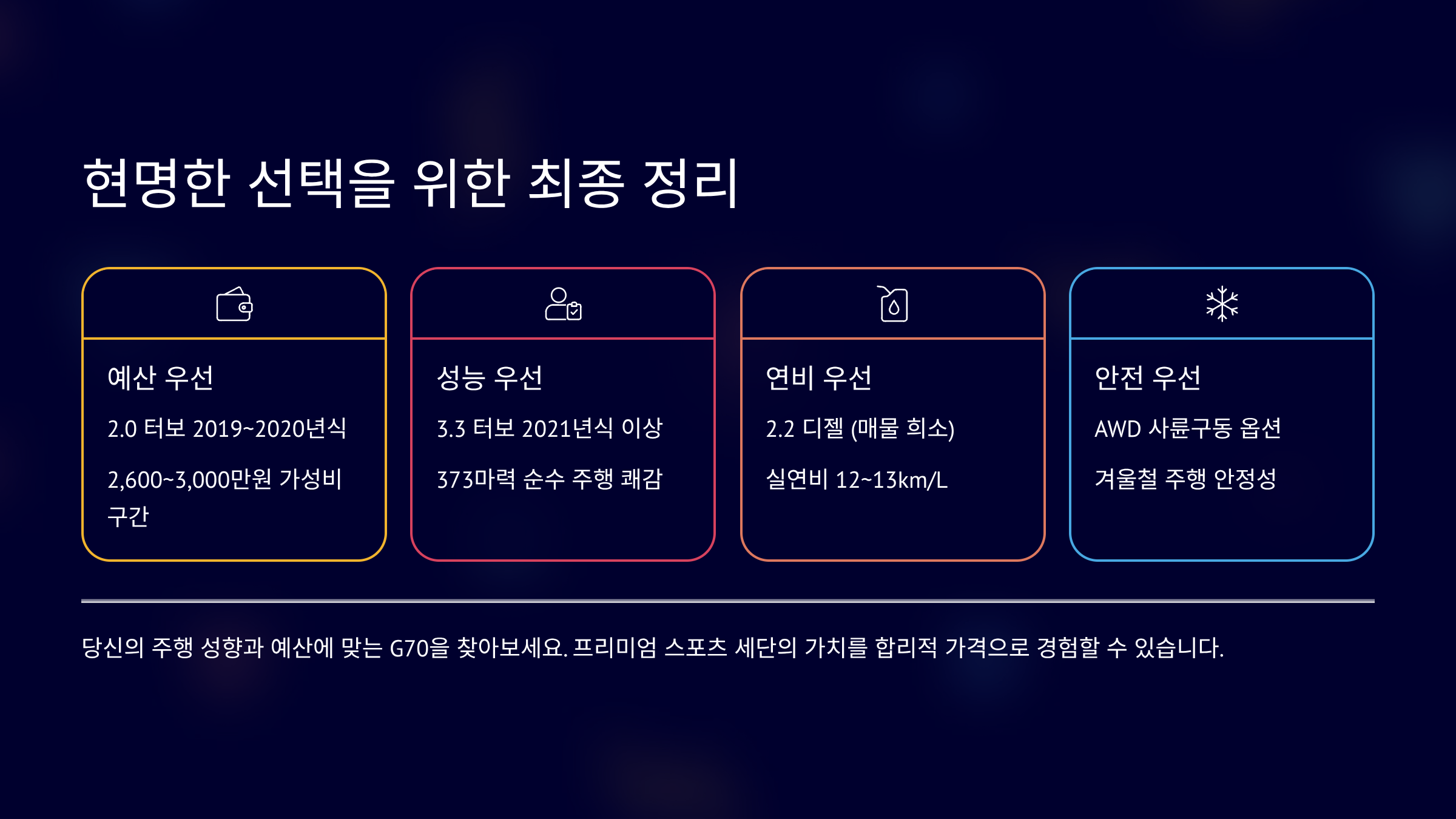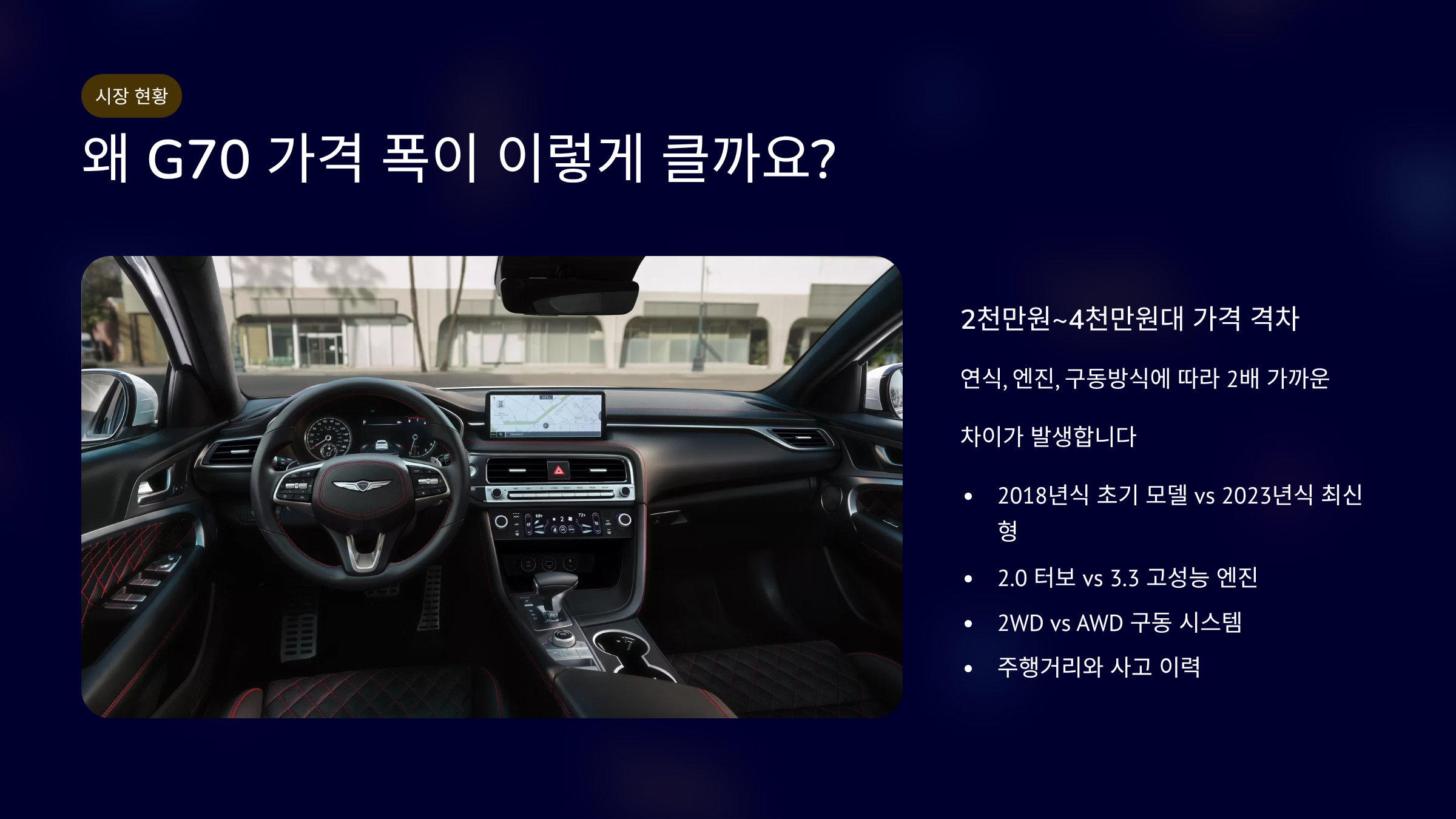 제네시스g70 중고차 가격 시세표는 연식과 엔진 차이가 핵심입니다. 2.0 터보는 가성비가 좋습니다. 3.3 터보는 퍼포먼스가 강점입니다. 디젤은 연비 면에서 유리합니다. AWD는 안정성이 장점입니다. 주행 성향과 예산에 맞춰 선택하시기 바랍니다.