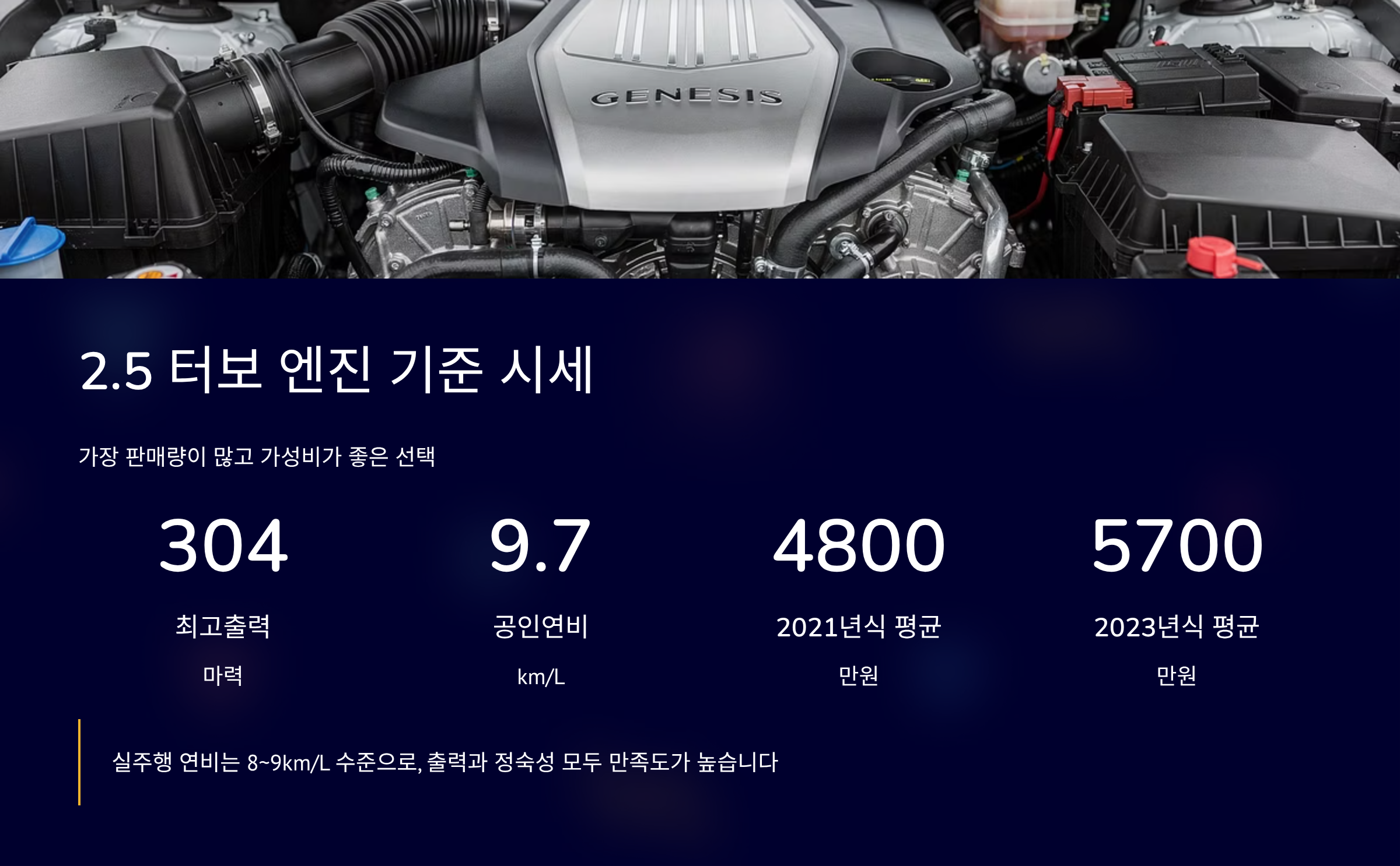 2.5 터보는 가장 판매량이 많습니다. 최고출력 304마력입니다. 공인연비는 9.7km/L입니다. 실주행은 8~9km/L 수준입니다. 2021년식 평균 4,800만 원입니다. 2023년식은 5,700만 원 전후입니다. 가성비 측면에서는 2.5 터보가 균형이 좋습니다. 후기에서는 출력과 정숙성 모두 만족도가 높다고 합니다.