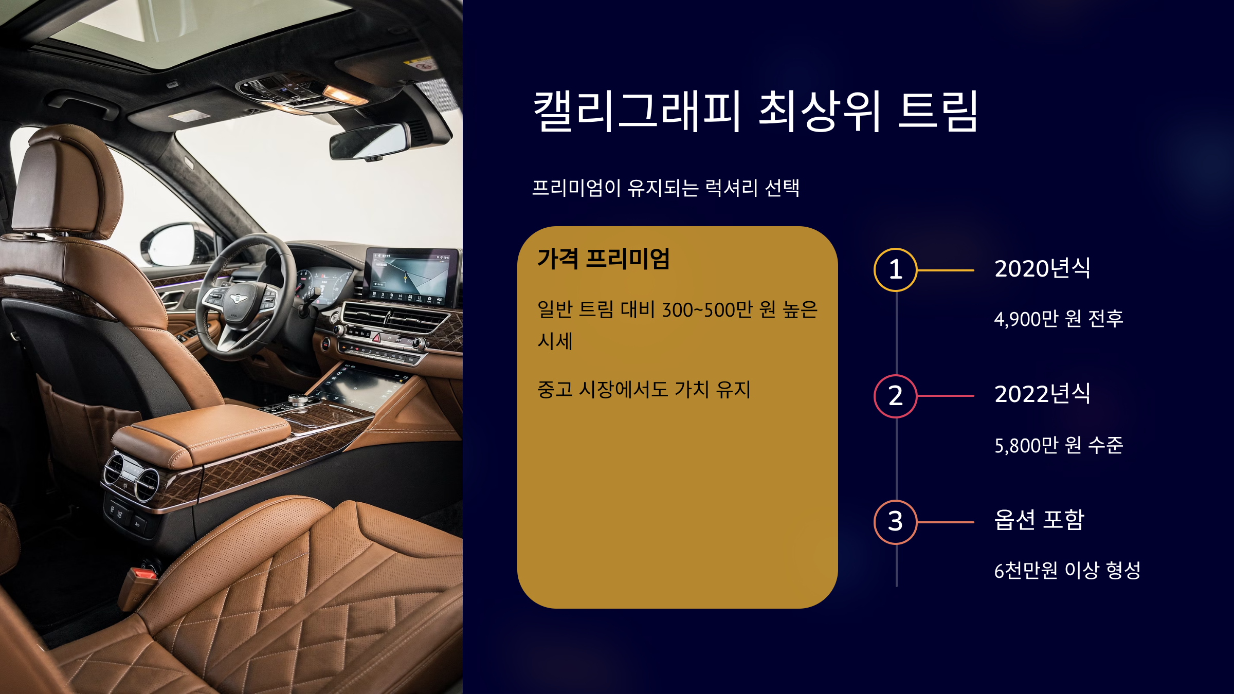 캘리그래피는 최상위 트림입니다. 2020년식은 4,900만 원 전후입니다. 2022년식은 5,800만 원 수준입니다. 옵션 포함 시 6천만원 이상 형성됩니다. 일반 트림 대비 300만~500만 원 높습니다. 중고 시장에서도 프리미엄이 유지됩니다. 후기에서는 실내 마감과 승차감 차이가 크다고 합니다. 고급 SUV를 찾는 수요가 꾸준합니다.