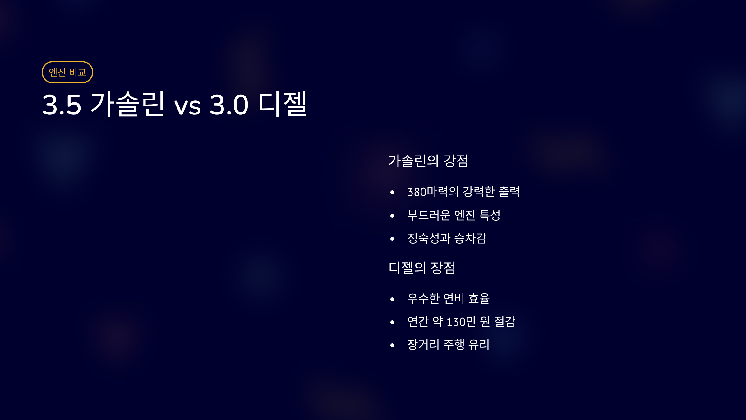 3.5 가솔린 최고출력은 380마력입니다. 공인연비는 8.2km/L입니다. 실주행은 7km/L 내외입니다. 3.0 디젤 공인연비는 11.8km/L입니다. 실주행은 10km/L 수준입니다. 경유 1,600원 기준 연 2만km면 약 320만 원입니다. 가솔린은 연간 약 450만 원 수준입니다. 장거리 위주라면 디젤 만족도가 높다는 후기가 많습니다.