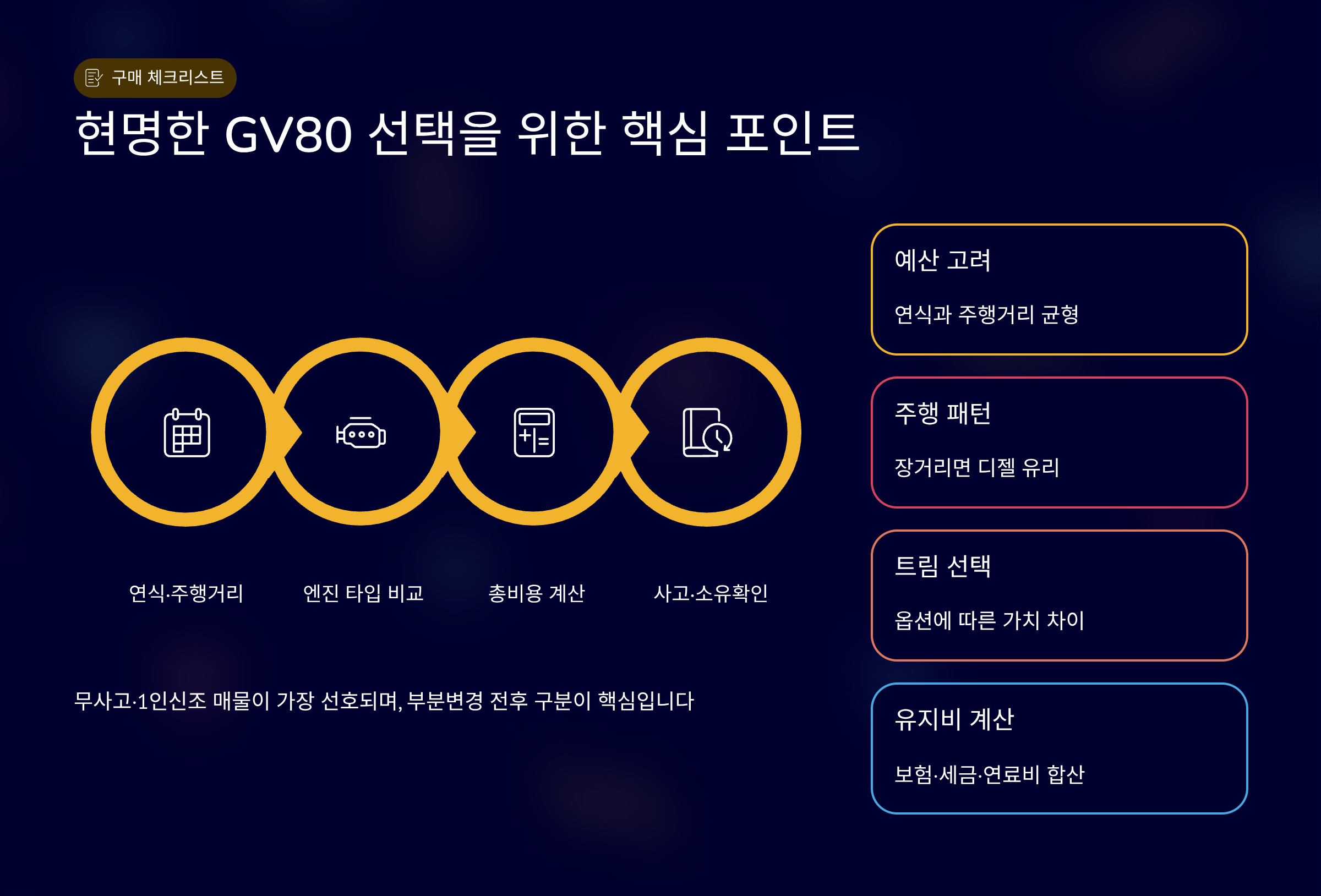 제네시스gv80 중고차 가격 시세표는 연식과 트림 차이가 핵심입니다. 2.5 터보는 가성비, 3.5는 출력이 강점입니다. 디젤은 유지비 측면에서 유리합니다. 캘리그래피는 프리미엄이 유지됩니다. 연식·연비·세금까지 계산해야 합니다. 예산과 주행 패턴을 고려해 선택하시기 바랍니다.