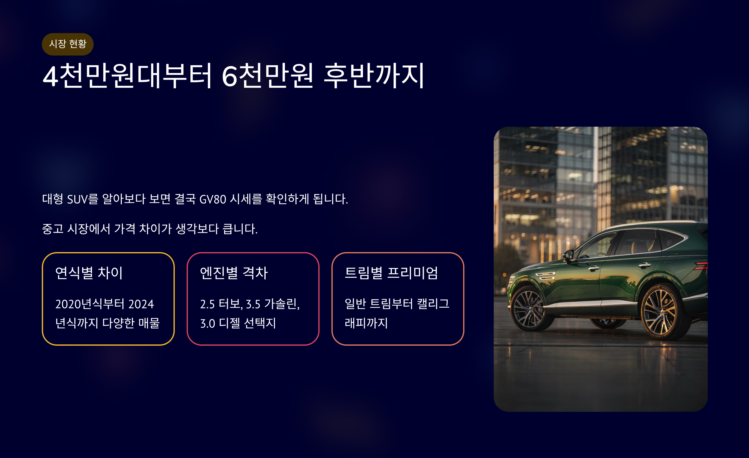 2020년 3.0 디젤은 4,500만~5,200만 원입니다. 2021년 3.5 가솔린은 4,900만~5,600만 원입니다. 2022년 2.5 터보 평균 5,300만 원입니다. 2023년식은 트림에 따라 6천만원대도 형성됩니다. 감가율은 3년 기준 약 25~30% 수준입니다. GV80은 대형 SUV 중 감가 방어가 강한 편입니다. 딜러 현장에서는 AWD 옵션 포함 차량이 빠르게 거래됩니다. 시세표 확인 시 트림 차이를 꼭 비교해야 합니다.
