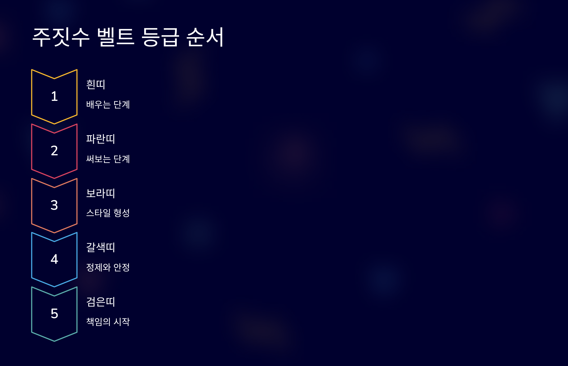 1. 주짓수 띠란? 색상별 의미와 승급기준 / 단계별 역할주짓수 띠의 개념과 중요성주짓수에서 띠(Belt)는 실력과 경험을 나타내는 중요한 요소입니다. 띠는 단순한 장식이 아니라 개인의 성장 과