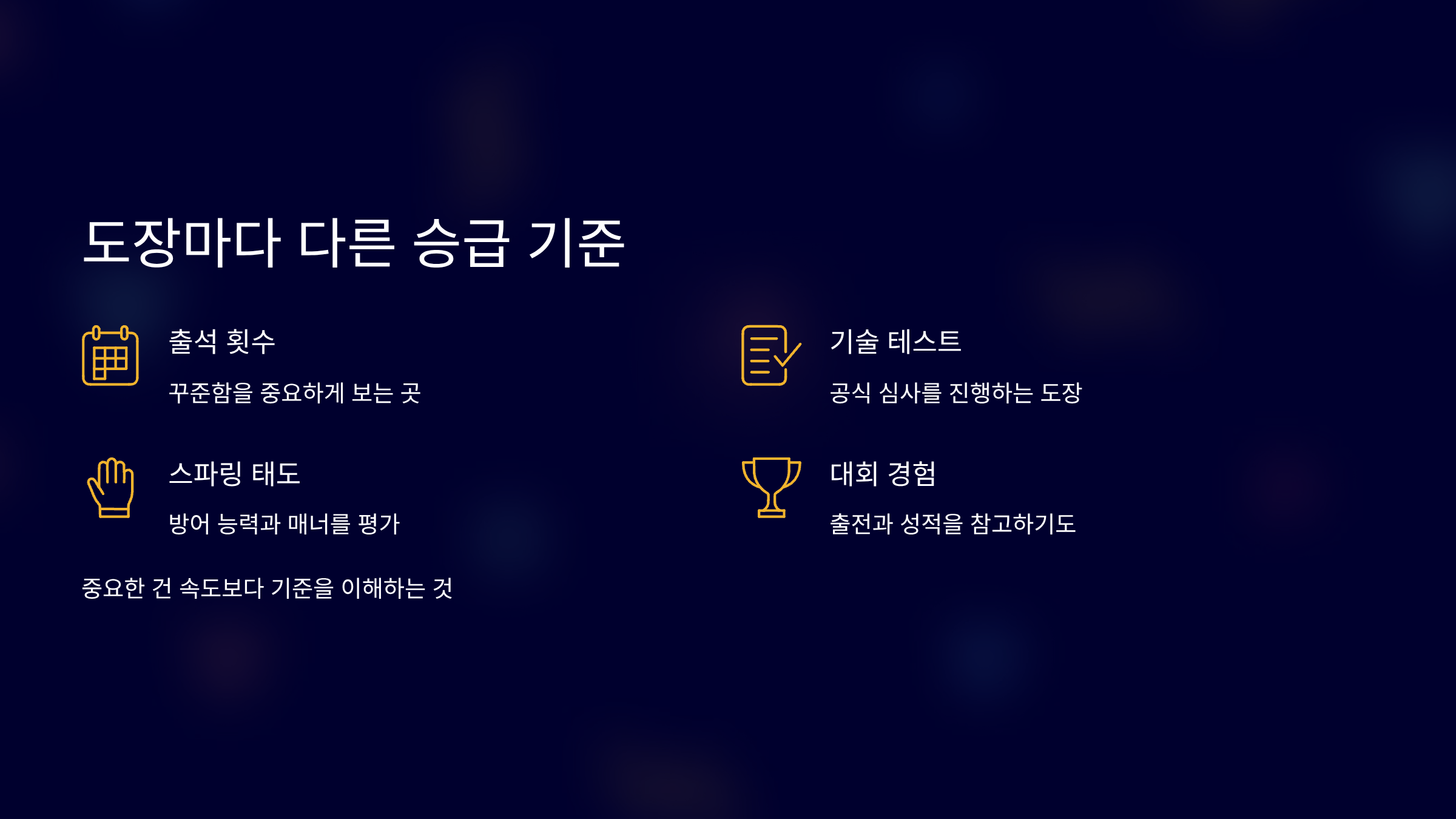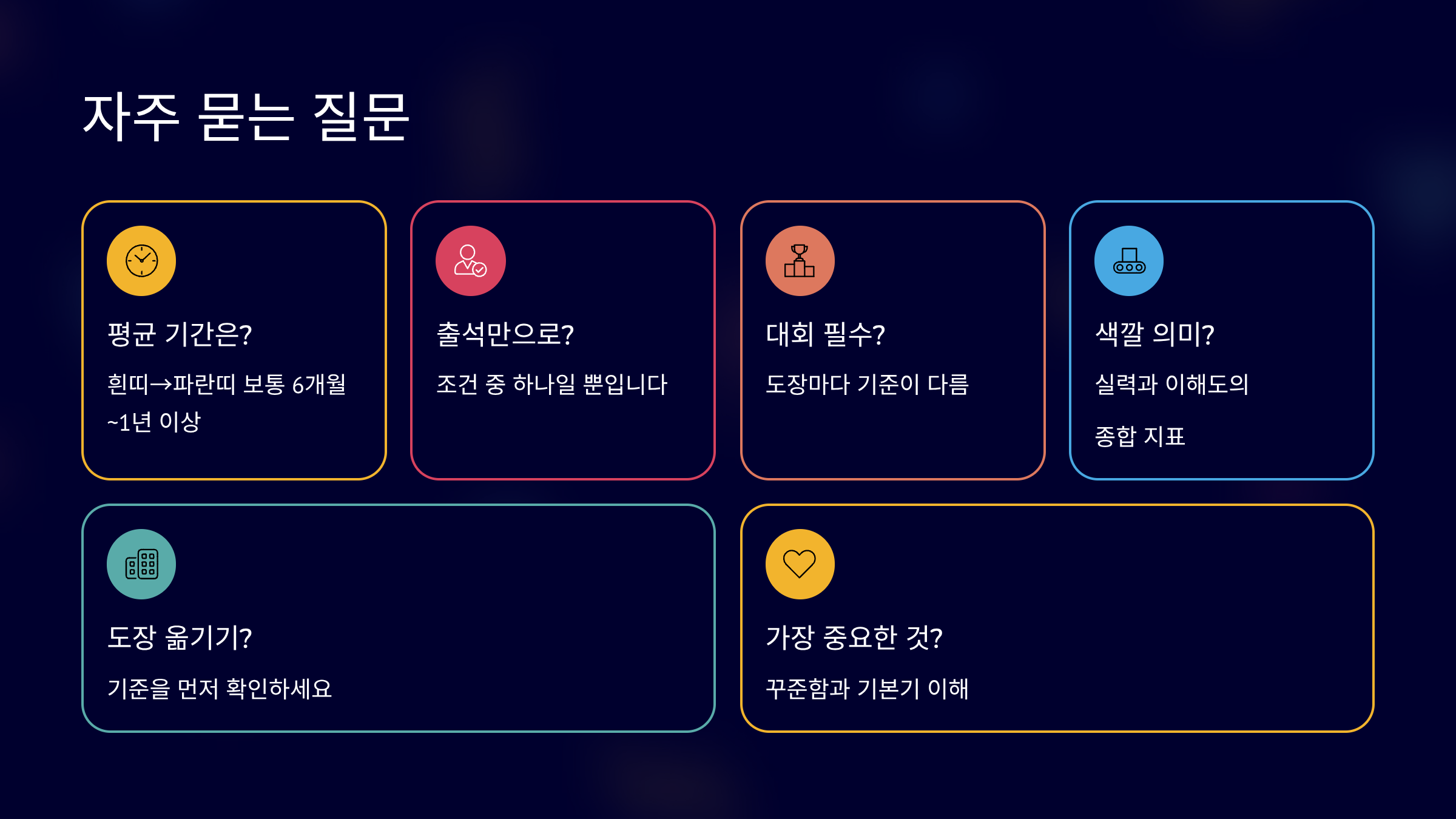 흰띠에서 파란띠까지는 비교적 빠르게 느껴질 수 있습니다.