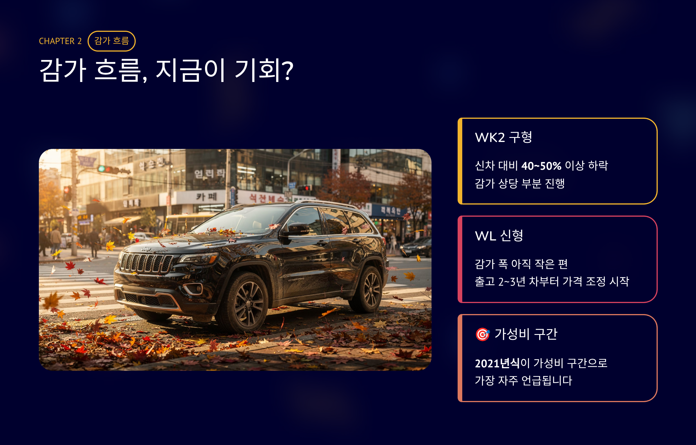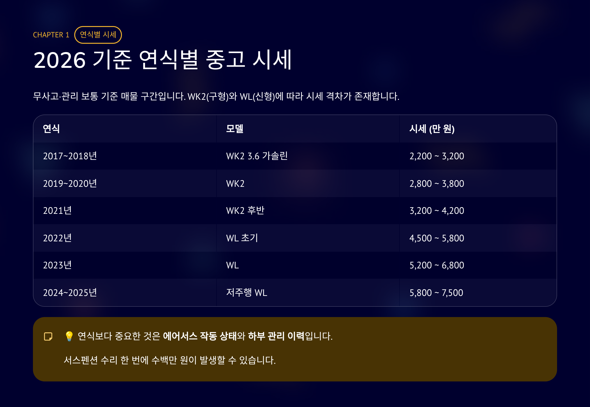 WK2는 감가가 상당 부분 진행된 구간입니다. 신차 대비 40~50% 이상 하락한 매물도 보입니다. WL은 아직 감가 폭이 크지 않은 편입니다. 출고 2~3년 차부터 가격 조정이 시작되는 흐름입니다.