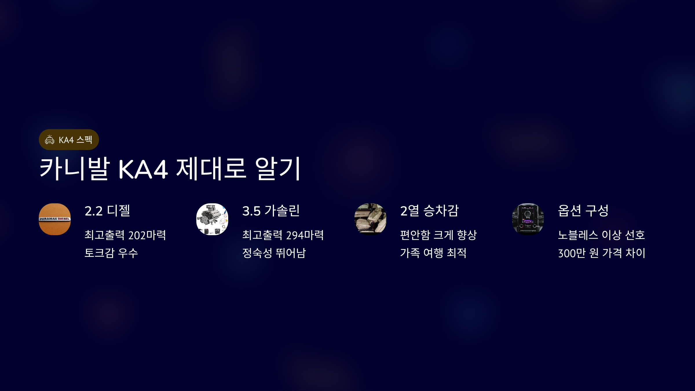 KA4는 2020년 풀체인지 모델입니다. 2.2 디젤과 3.5 가솔린 엔진입니다. 2.2 디젤 최고출력 202마력입니다. 3.5 가솔린은 294마력입니다. 실내 공간과 승차감이 크게 개선되었습니다. 옵션 구성에 따라 300만 원 이상 차이 납니다. 후기에서는 2열 승차감이 편안하다는 평가가 많습니다. 가족용·사업용 모두 수요가 높습니다.