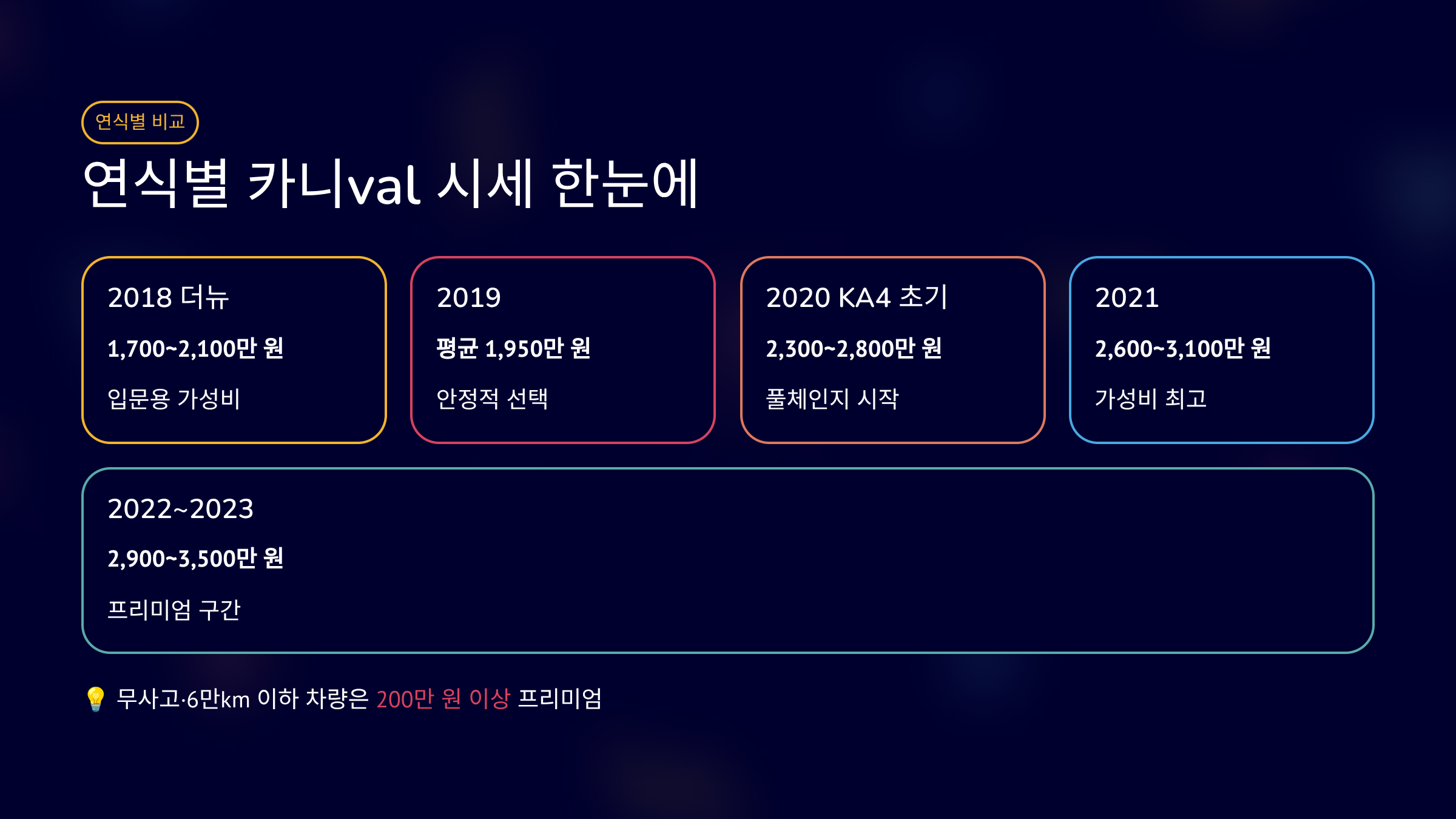 2018년 더뉴 카니발은 1,700만~2,100만 원입니다. 2019년식은 평균 1,950만 원 수준입니다. 2020년 KA4 초기형은 2,300만~2,800만 원입니다. 2021년형은 2,600만~3,100만 원입니다. 2022~2023년형은 2,900만~3,500만 원 구간입니다. 같은 연식이라도 무사고·주행거리 6만km 이하 차량은 200만 원 이상 차이 납니다. 실구매 후기에서는 노블레스 이상 트림 선호도가 높다고 합니다. 연식별 비교 시 세대 구분이 가장 중요합니다.