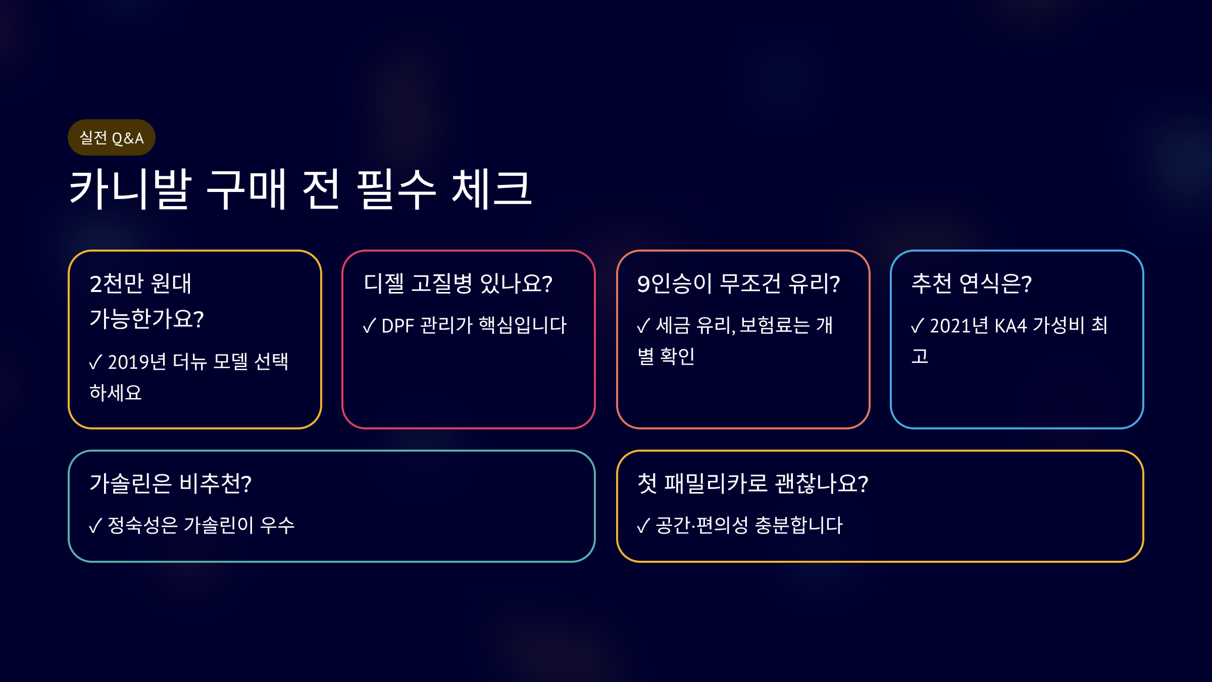 카니발 중고차 가격은 세대와 인승에 따라 확연히 다릅니다. 올뉴는 가성비, KA4는 상품성이 강점입니다. 9인승은 세금 혜택, 디젤은 유지비 장점이 있습니다. 연식·연비·세금까지 함께 계산해야 합니다. 예산 2천만원대라면 더뉴 모델이 현실적입니다. 3천만원 이상이면 KA4 선택이 만족도가 높다고 말씀드립니다.