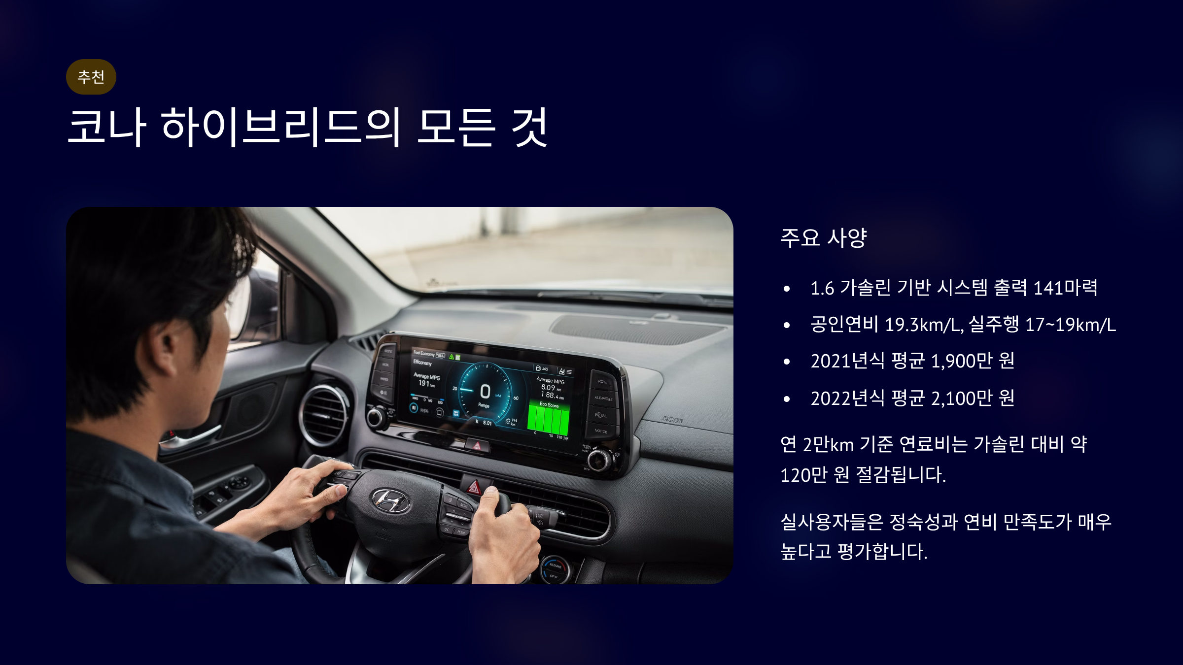 Q. 하이브리드 추천하나요? A. 연비 위주라면 좋습니다.