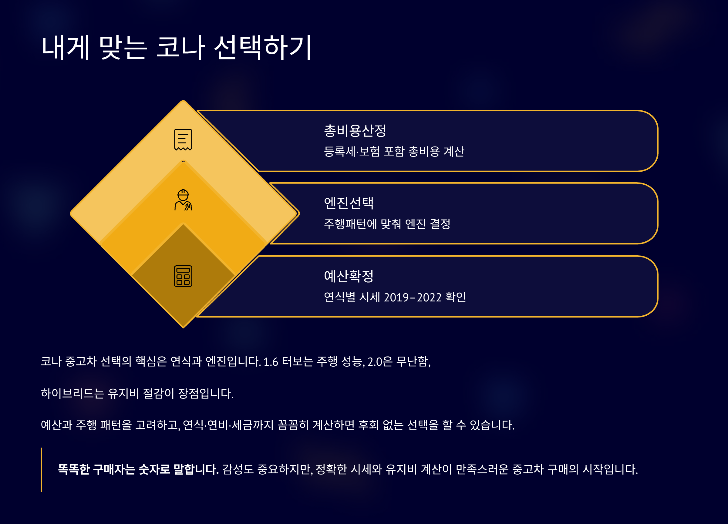 코나 중고차 가격 시세표는 연식과 엔진 선택이 핵심입니다.
