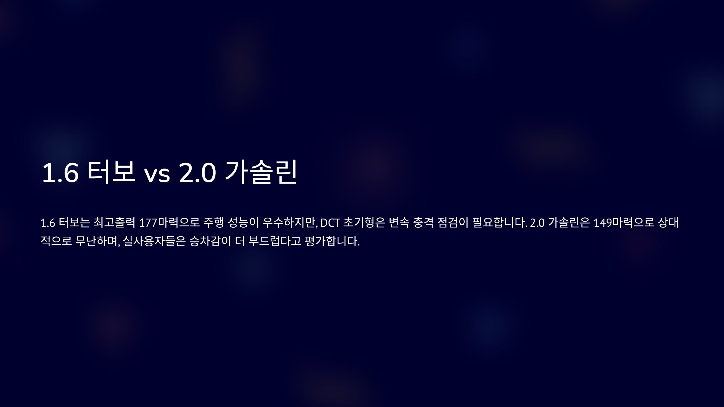 1.6 터보 최고출력은 177마력입니다. 7단 DCT가 적용됩니다. 공인연비는 12.8km/L입니다. 실주행은 10~11km/L 수준입니다. 2.0 가솔린은 149마력입니다. 실주행 연비는 11~12km/L입니다. DCT 초기형은 변속 충격 점검이 필요합니다. 후기에서는 2.0이 승차감이 더 부드럽다고 합니다.
