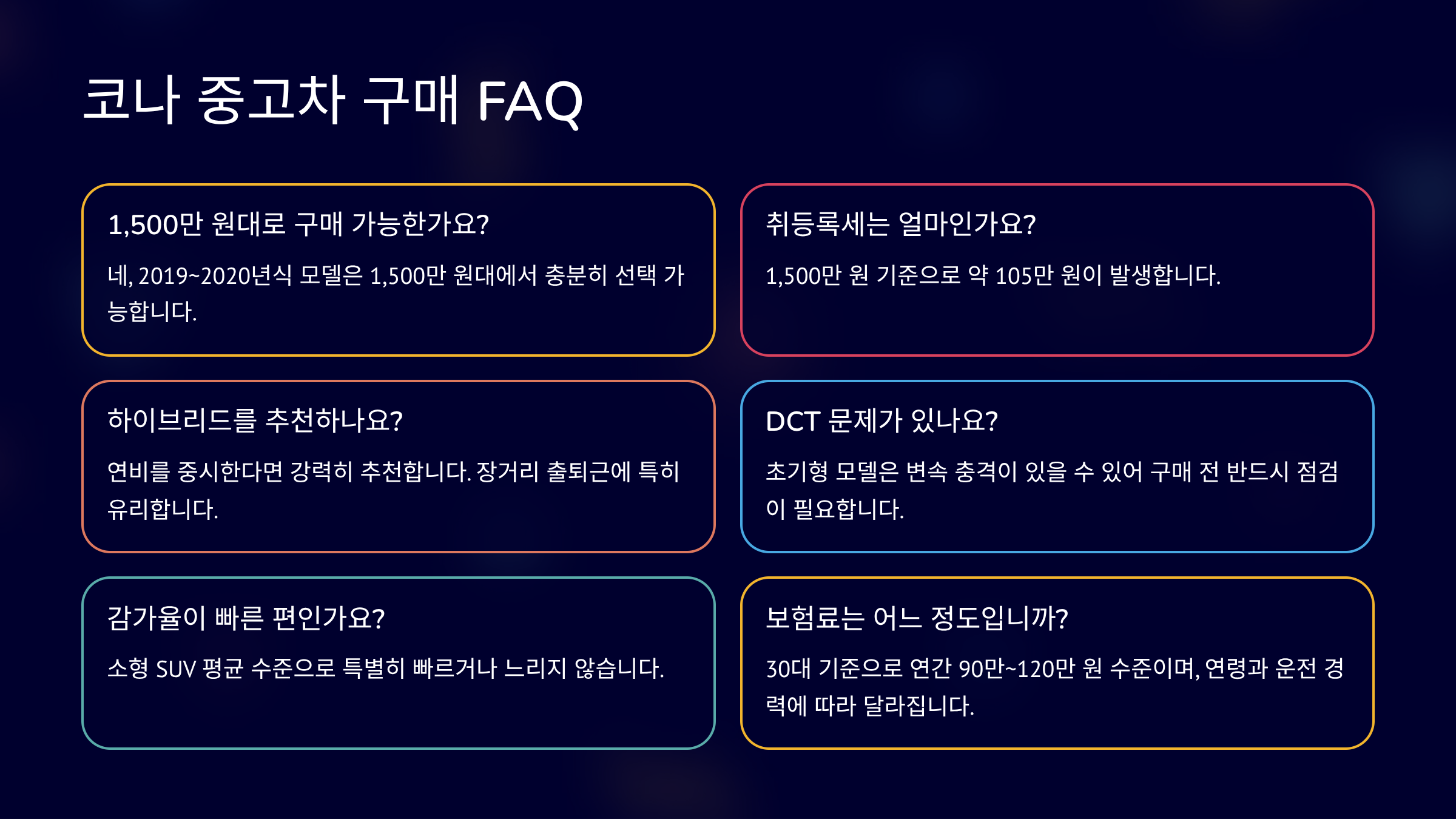 Q. 감가율 빠른가요? A. 소형 SUV 평균 수준입니다.