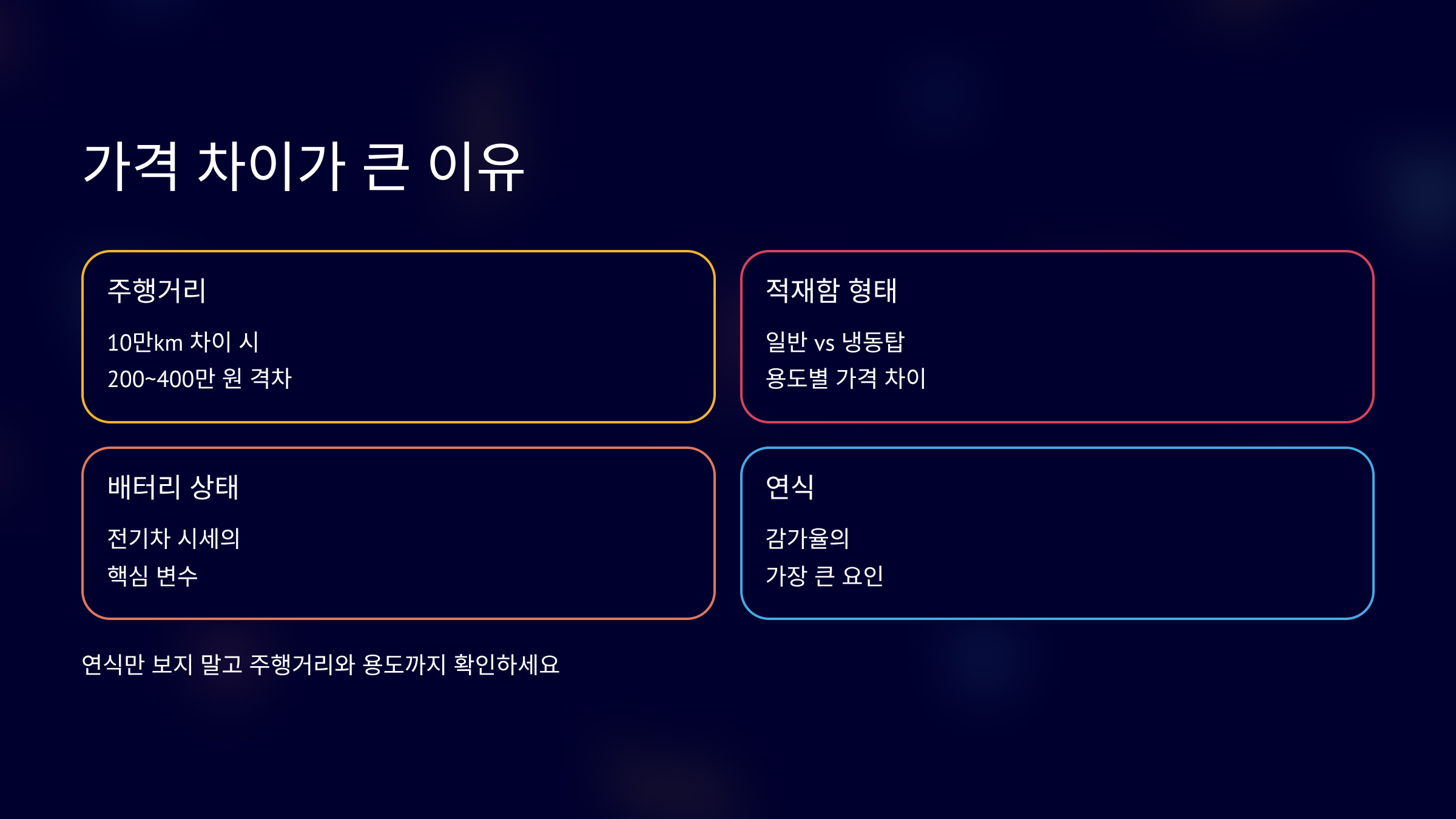 같은 연식이라도 주행거리 10만km 차이면 200만~400만 원 차이가 발생합니다.