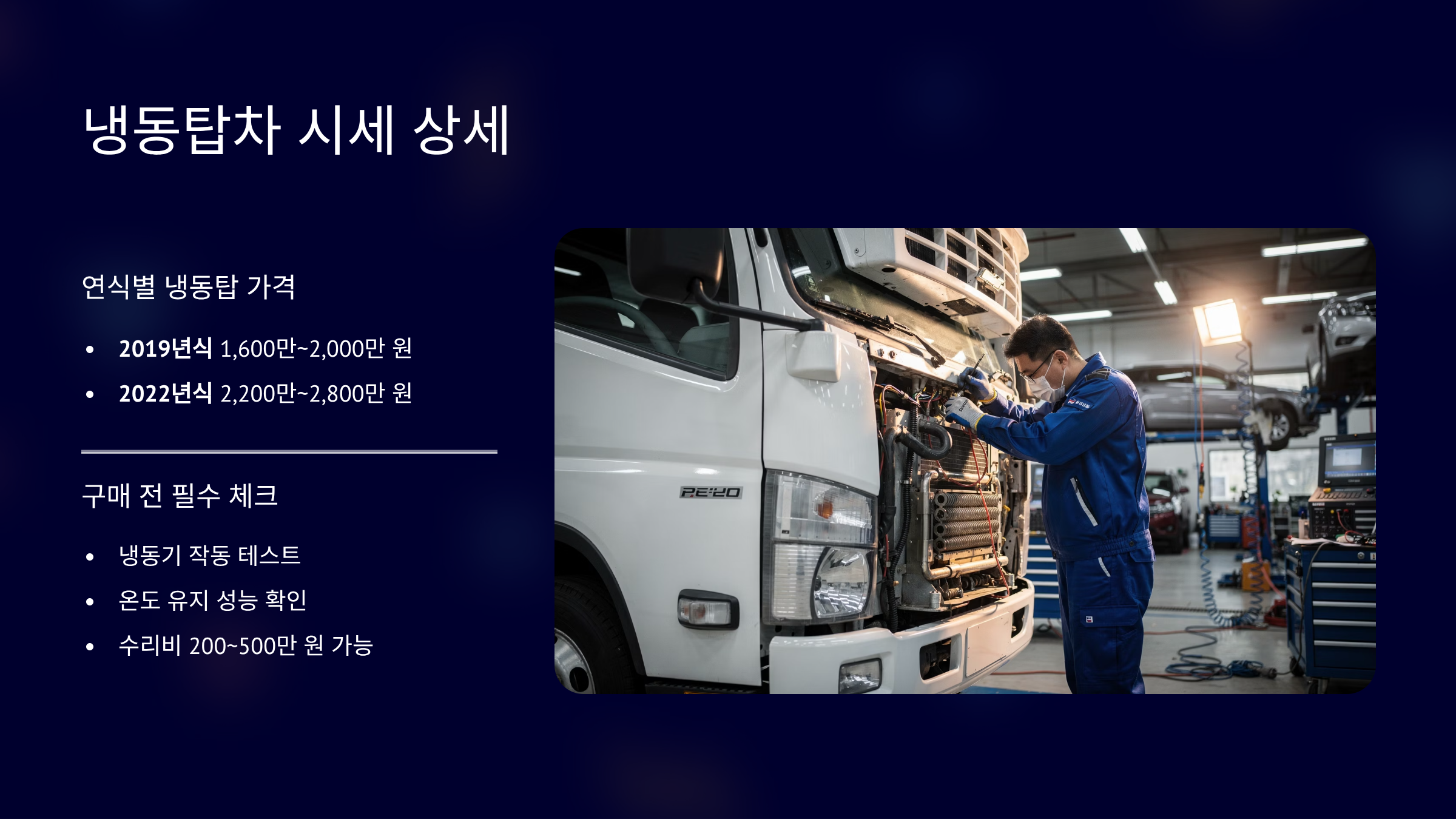 적재함 형태가 일반인지 냉동탑인지에 따라도 가격이 달라집니다.