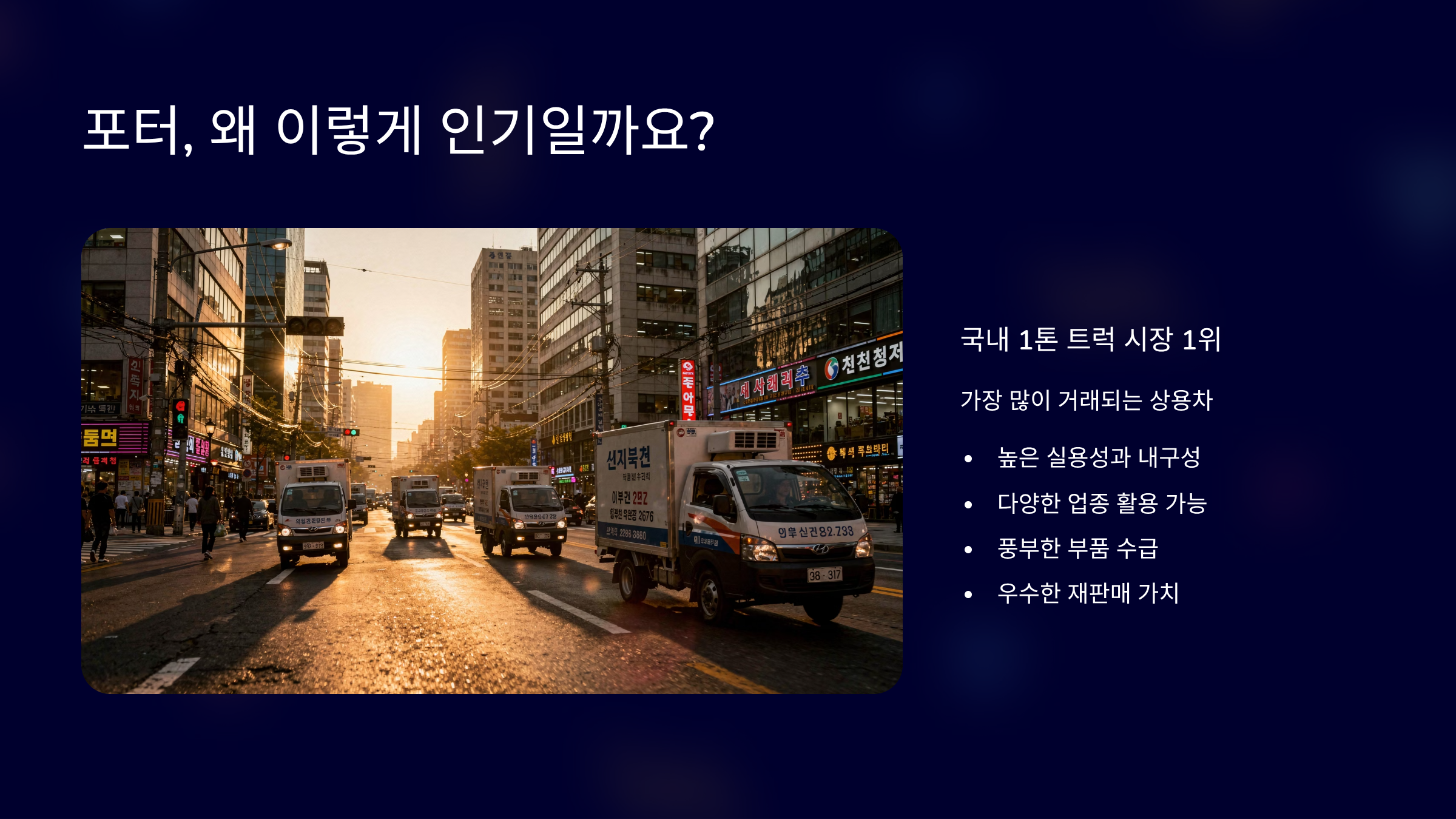 포터는 국내 1톤 트럭 시장에서 가장 많이 거래되는 상용차입니다.