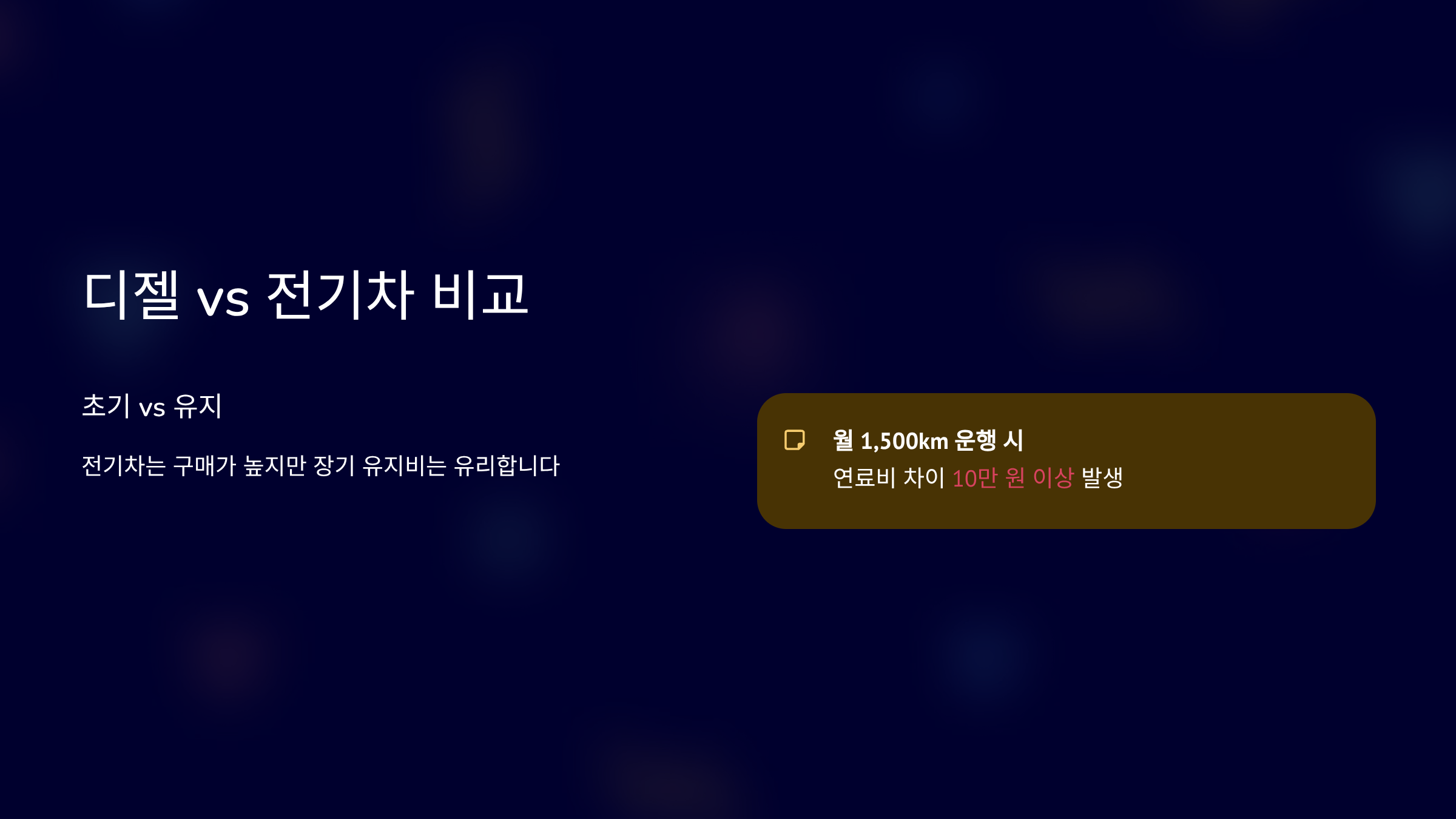 디젤은 초기 가격이 낮고, 전기차는 유지비가 낮습니다.