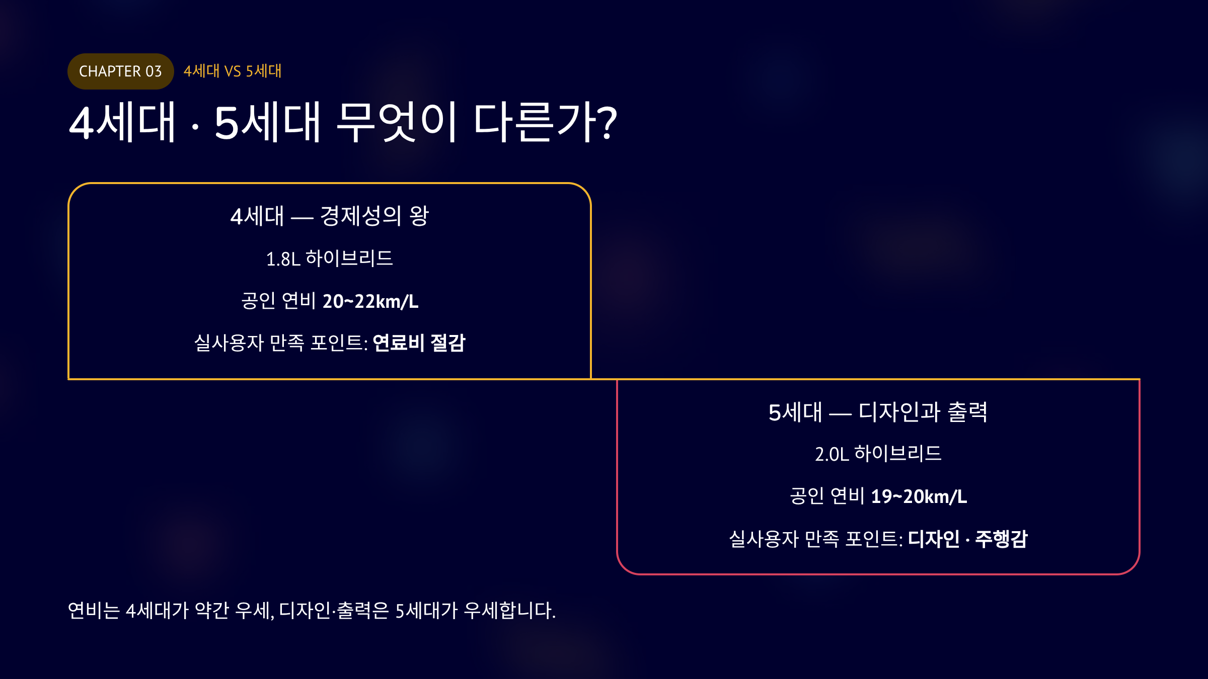4세대는 1.8 하이브리드입니다. 공인 연비는 20~22km/L입니다. 5세대는 2.0 하이브리드입니다. 공인 연비는 19~20km/L입니다. 연비는 4세대가 약간 더 좋습니다.