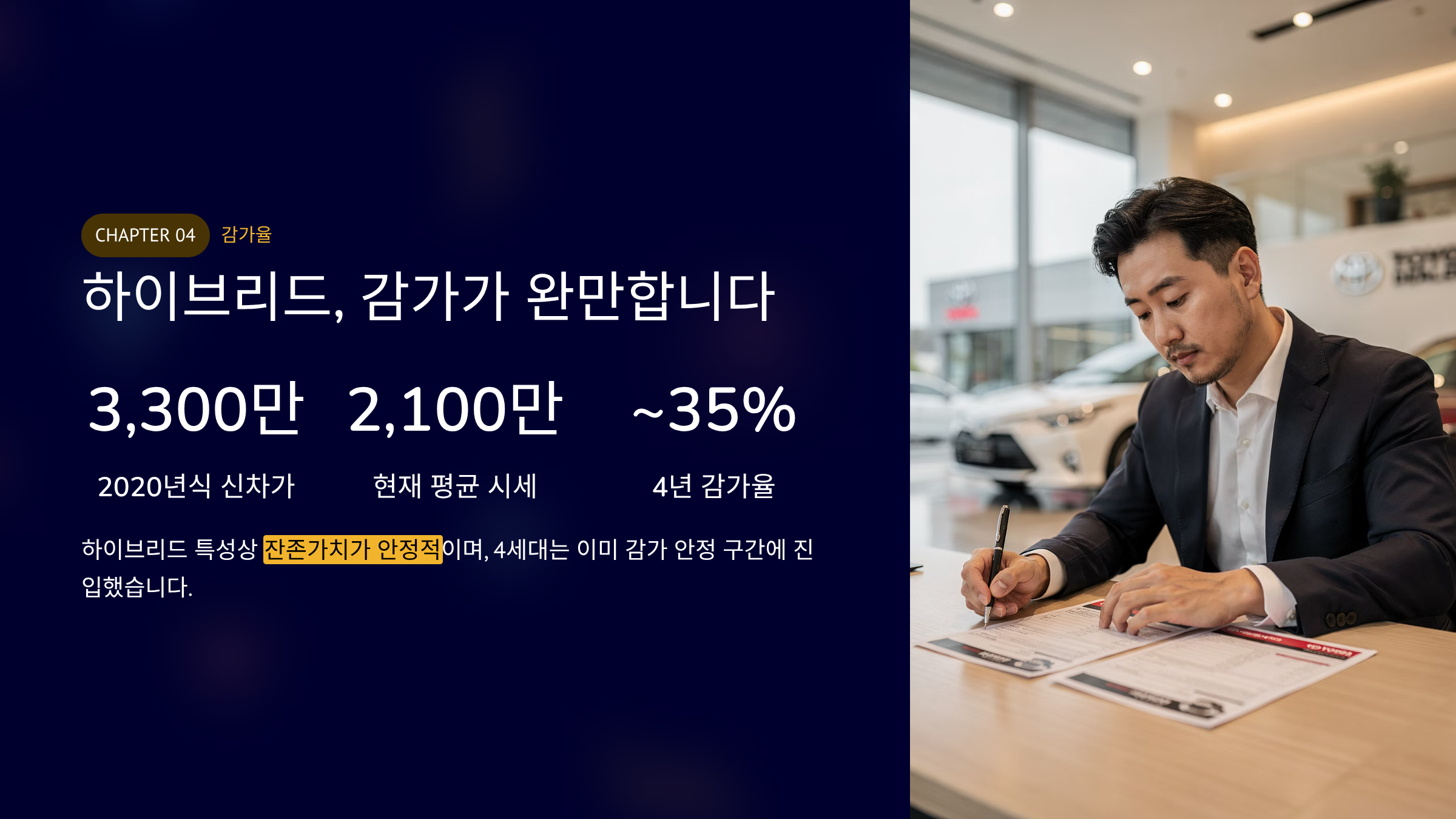 하이브리드 특성상 감가가 완만합니다. 잔존가치는 안정적인 편입니다.