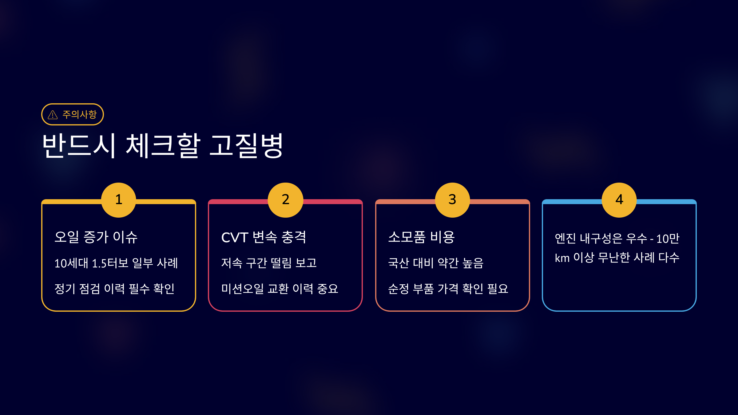 10세대 1.5터보에서 오일 증가 사례가 있었습니다. CVT 변속기 떨림 사례도 일부 보고됐습니다. 정기 점검 이력이 중요합니다. 미션오일 교환 이력은 꼭 확인해야 합니다.