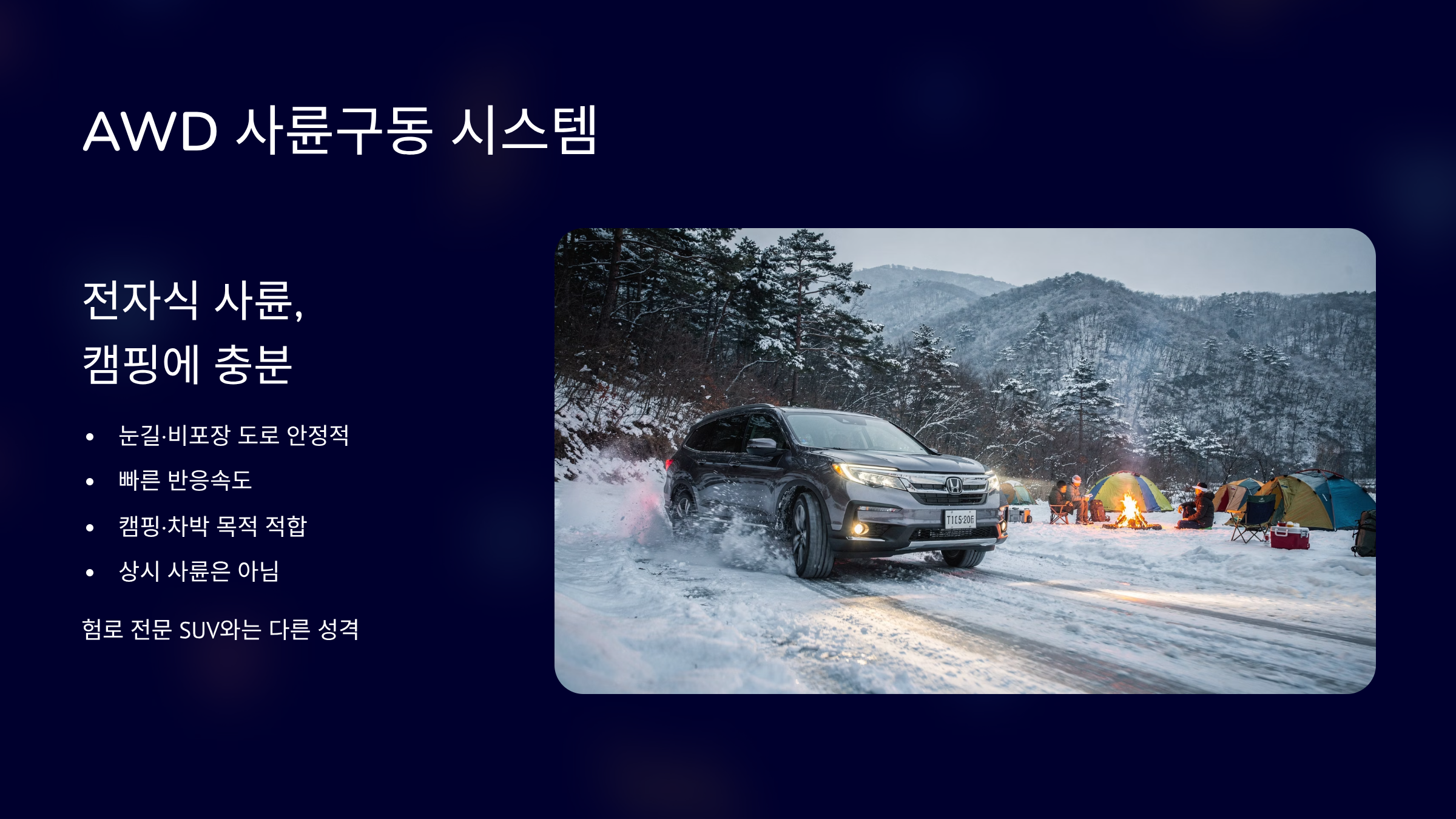 파일럿은 전자식 사륜구동 시스템입니다. 눈길과 비포장 도로에서 안정적입니다. 상시 사륜은 아니지만 반응 속도는 빠른 편입니다. 캠핑·차박 목적에는 충분한 성능입니다. 험로 주행 전용 SUV와는 성격이 다릅니다.