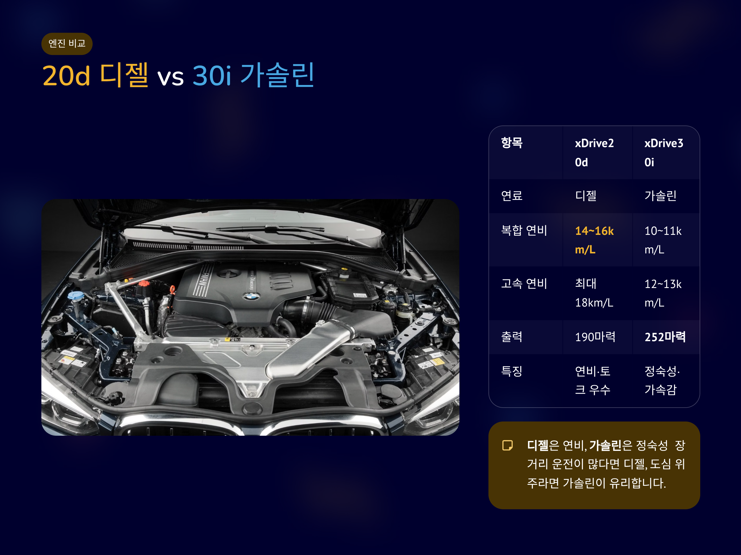 엔진에 따라 주행 성격과 연비가 달라집니다.