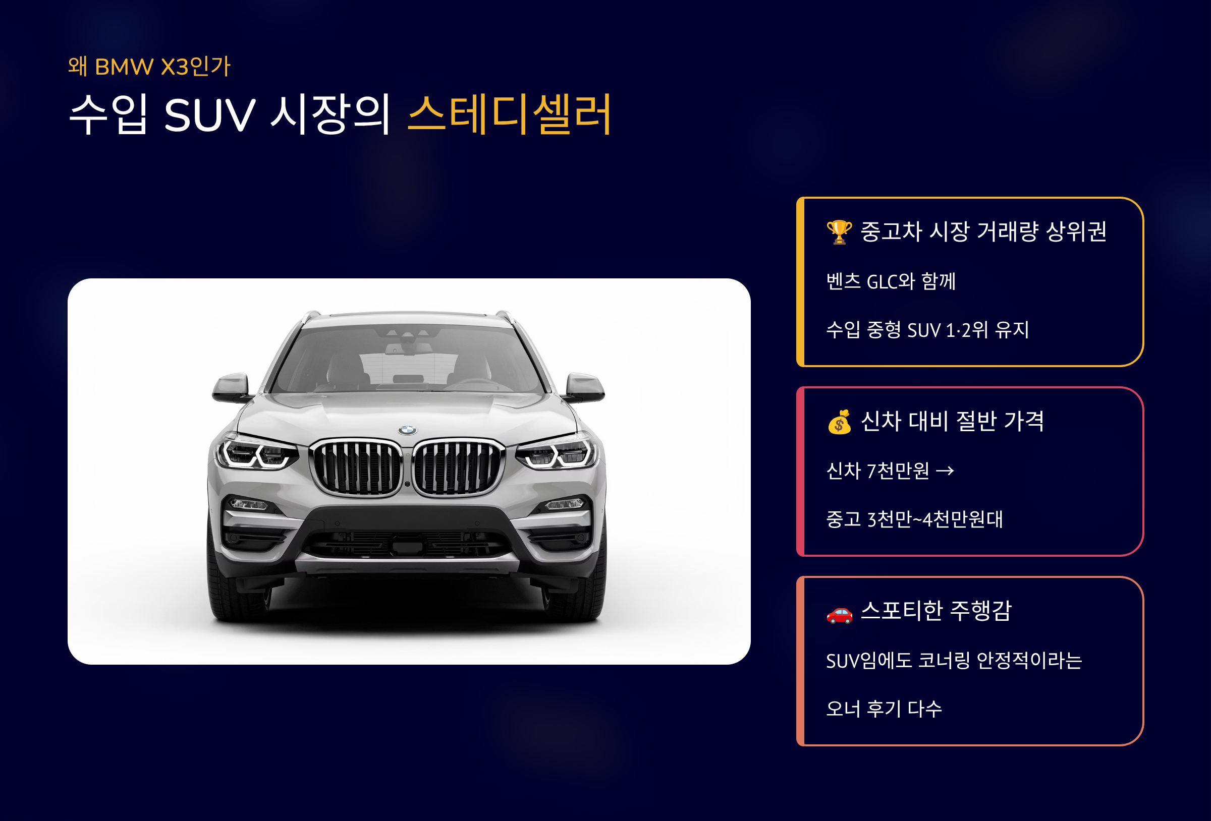 2026년 현재 X3는 벤츠 GLC와 함께 수입 중형 SUV 중고차 시장에서 거래량 상위권을 유지합니다.