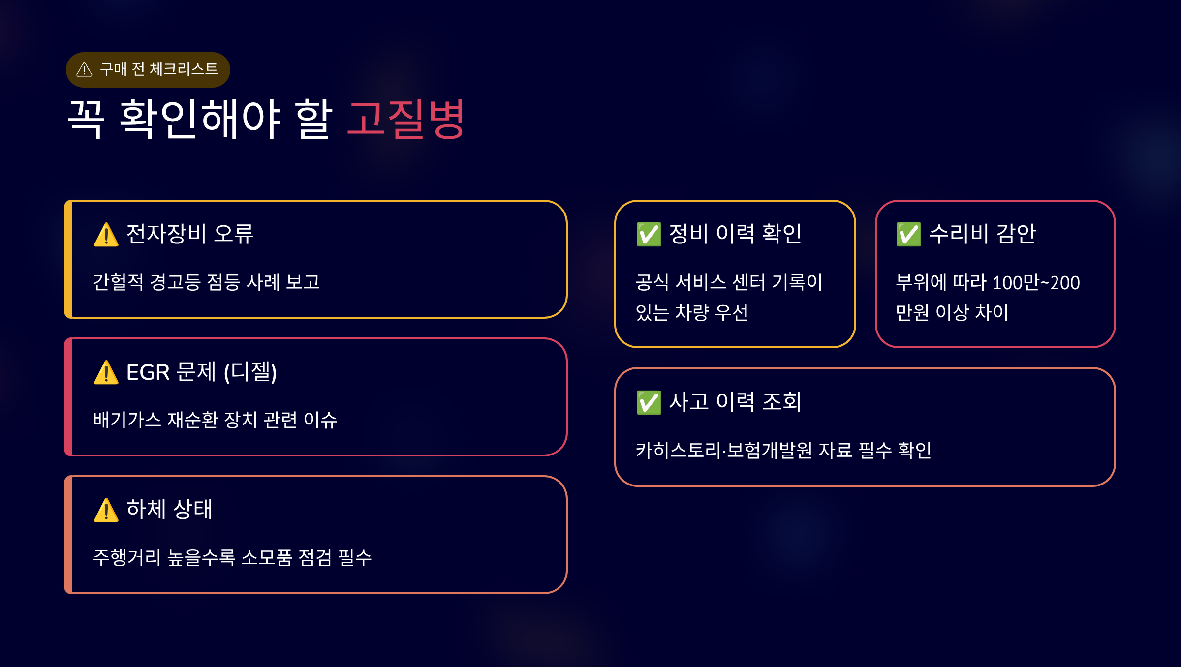 중고차 구매 시 하체 상태와 정비 기록 확인이 중요합니다.