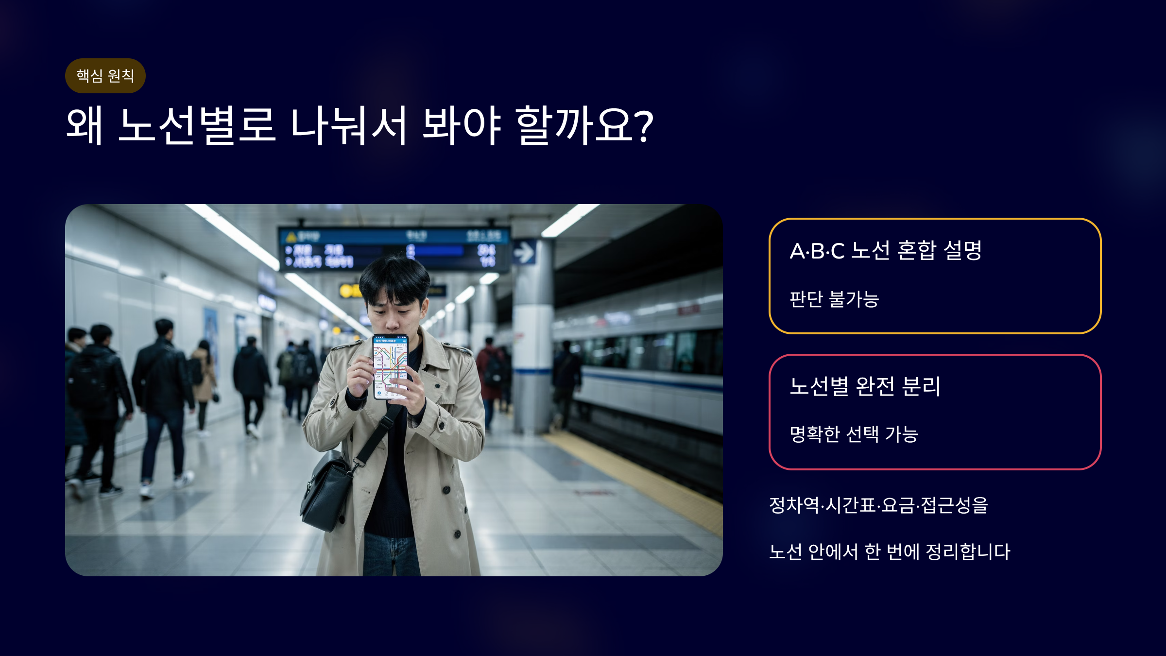 하지만 A·B·C 노선이 섞여 설명되면 실제로는 아무 판단도 못 하게 됩니다.
