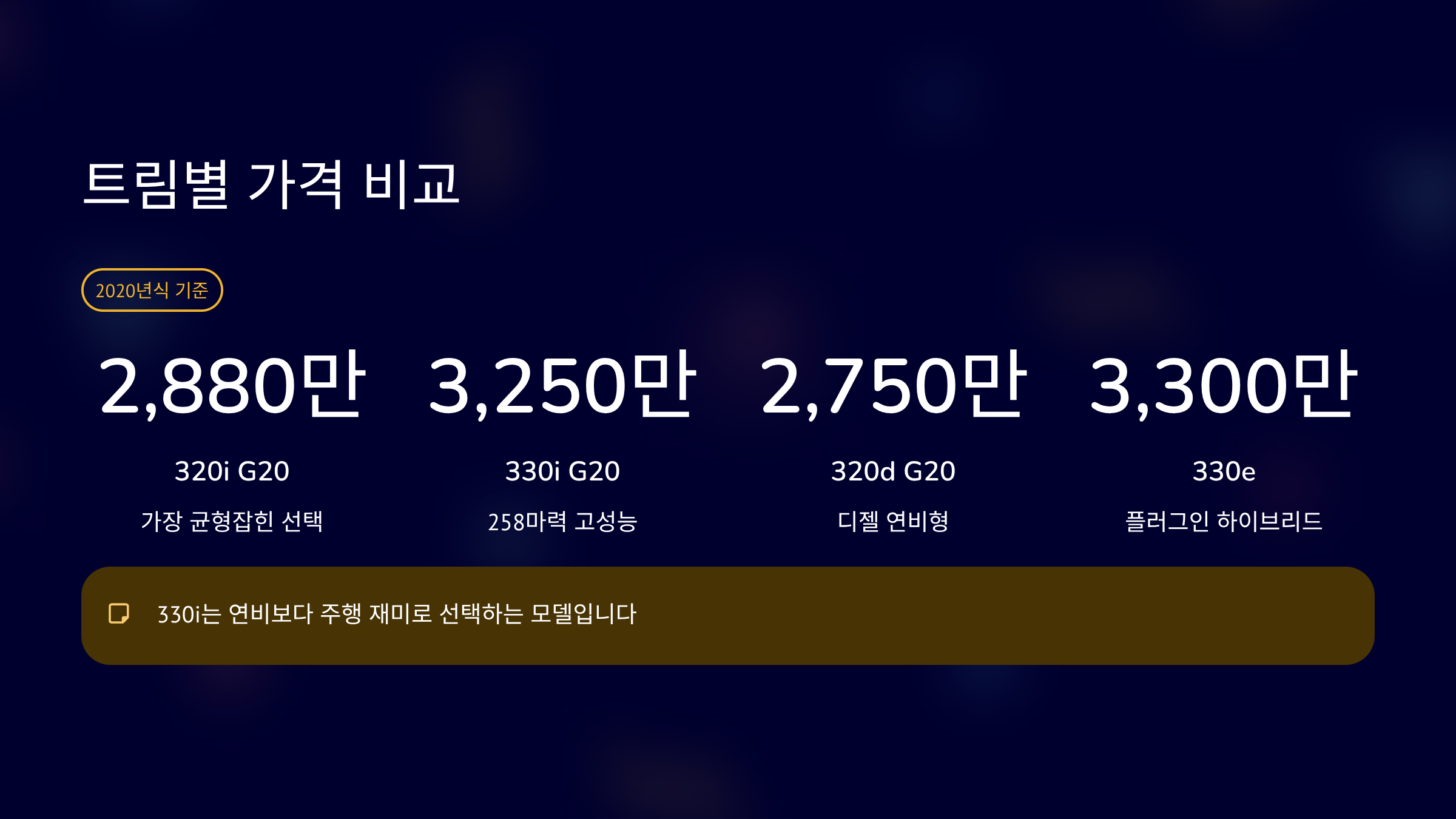 특히 320i, 330i, 320d는 매물도 많고 감가도 안정적입니다.