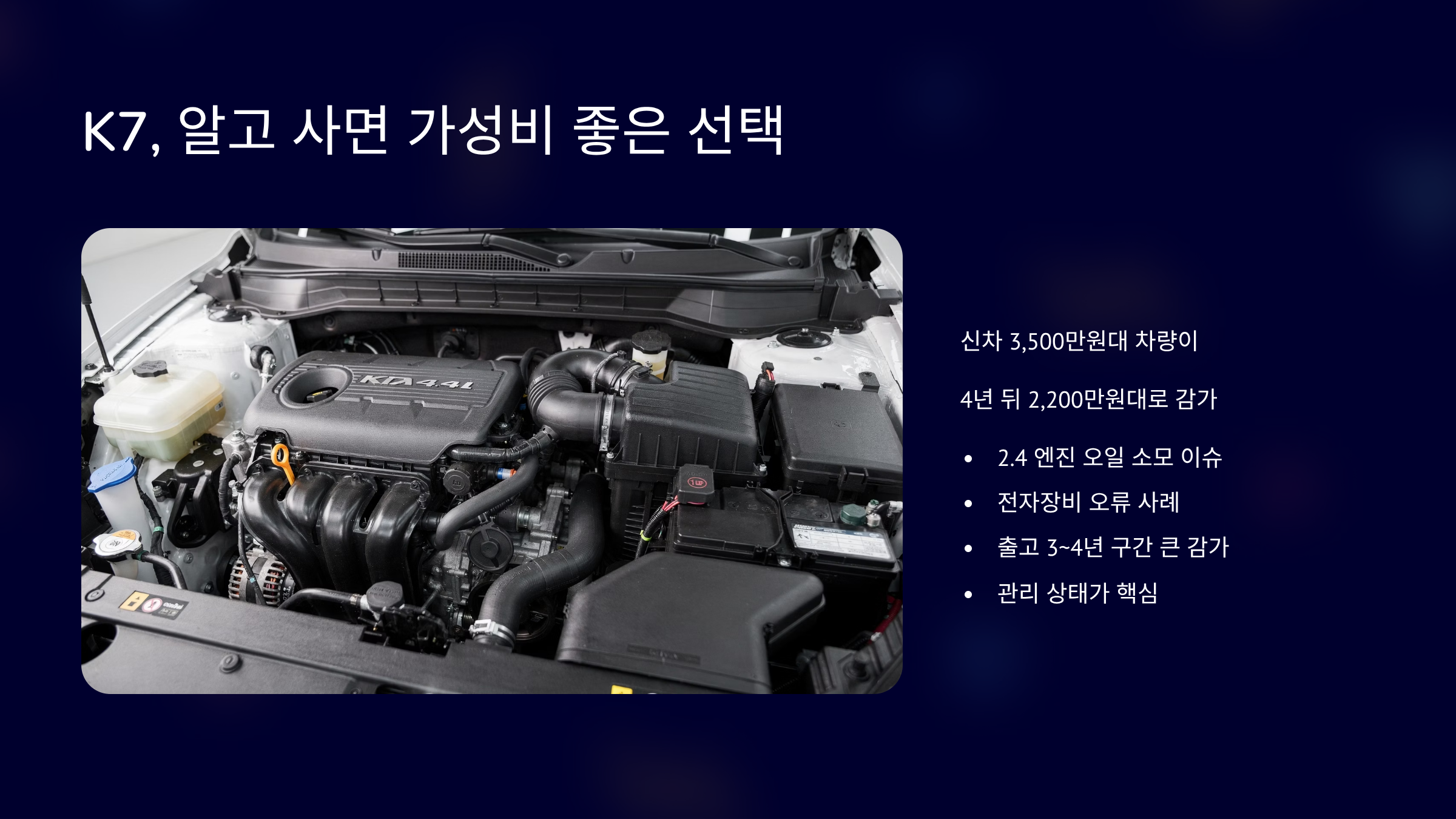 K7 중고차 가격은 엔진 선택과 관리 상태가 핵심입니다.